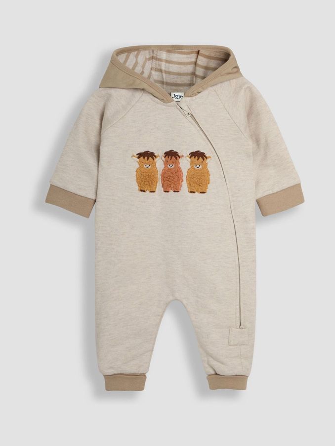 Natural Highland Cow Appliqué Zip Up Hooded Romper