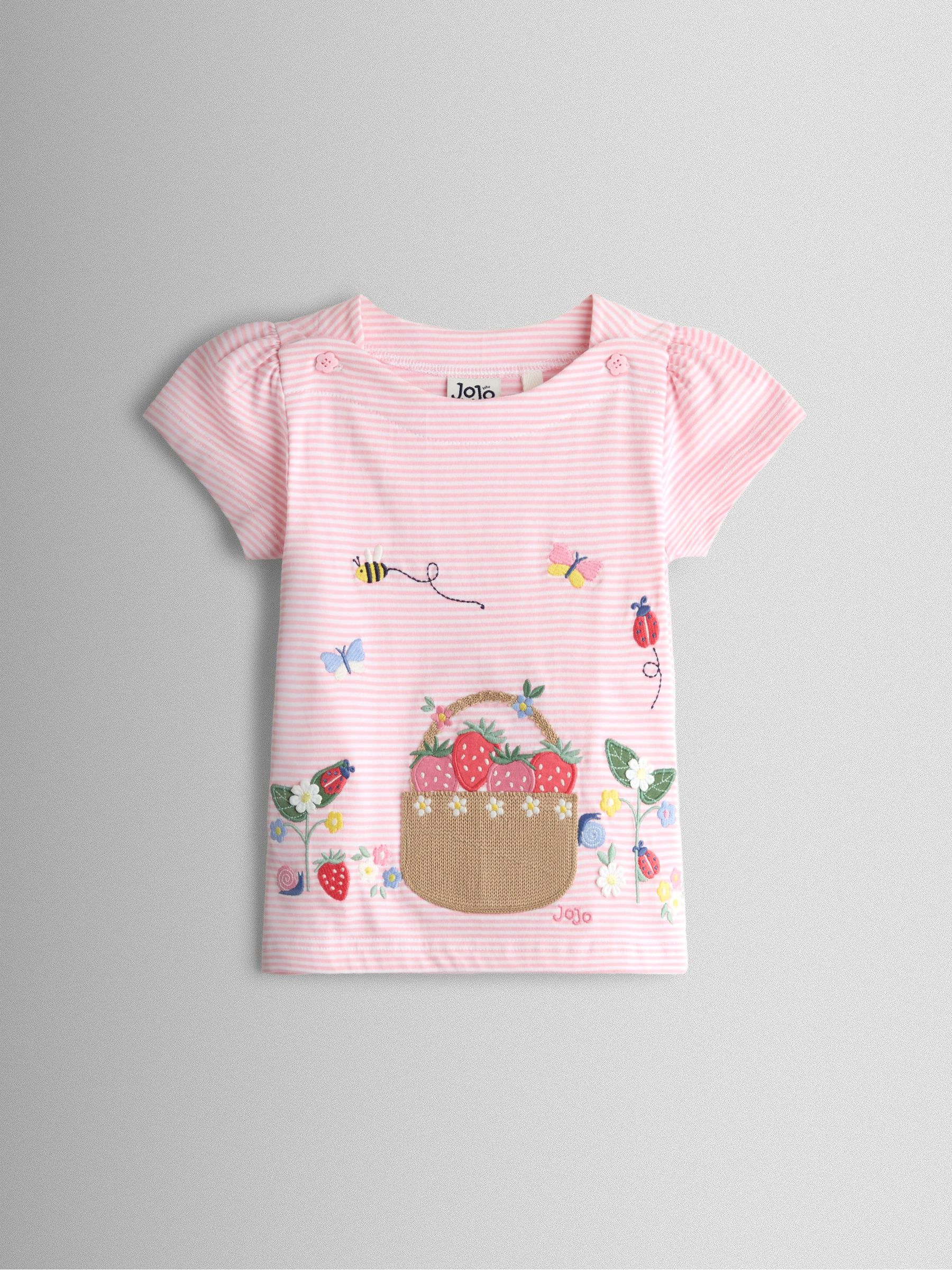 Pink Strawberry Picnic Basket Appliqué Button Shoulder T-shirt