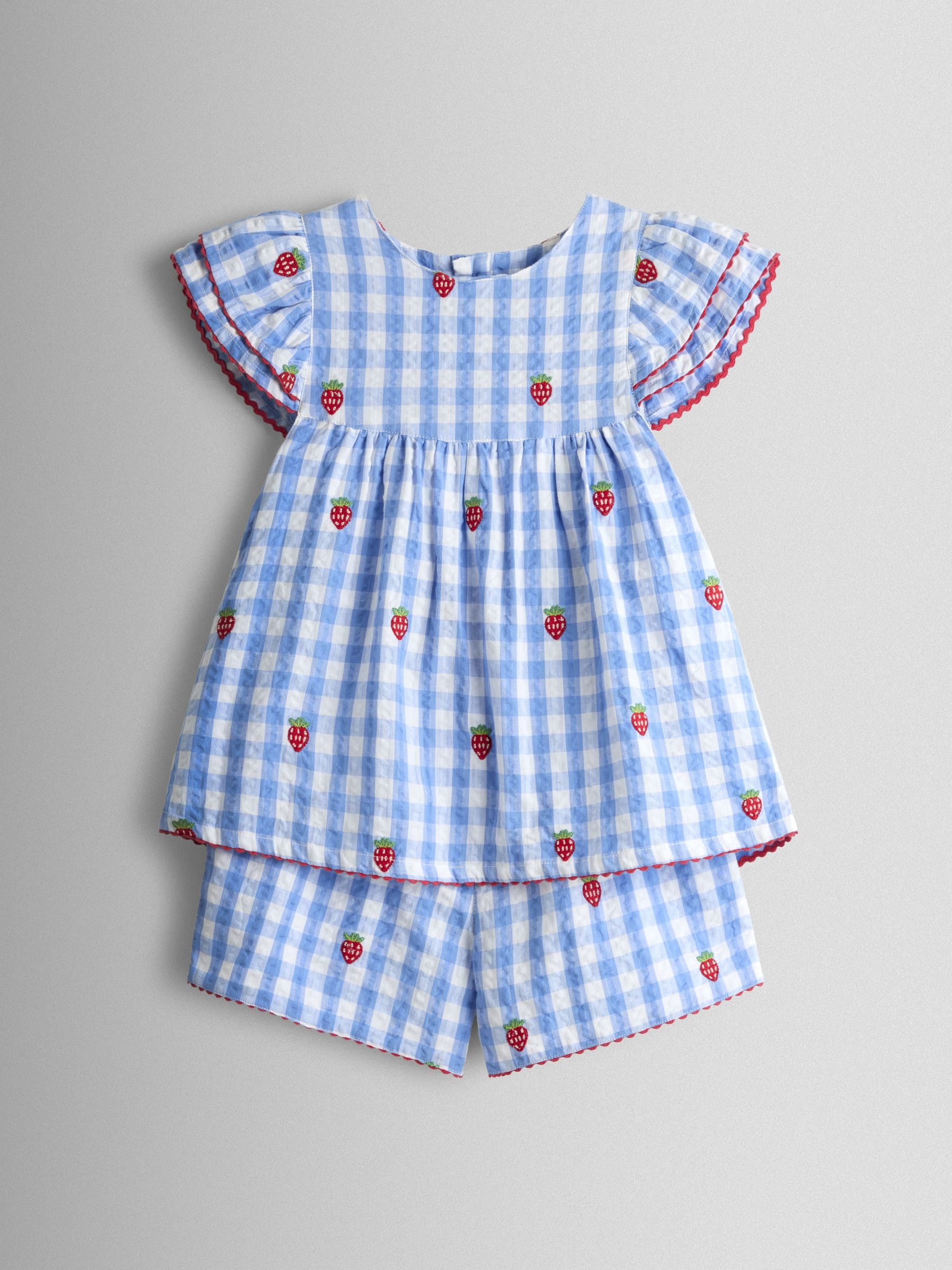 Pink Gingham Strawberry Frill Sleeve Embroidered Top & Short Set