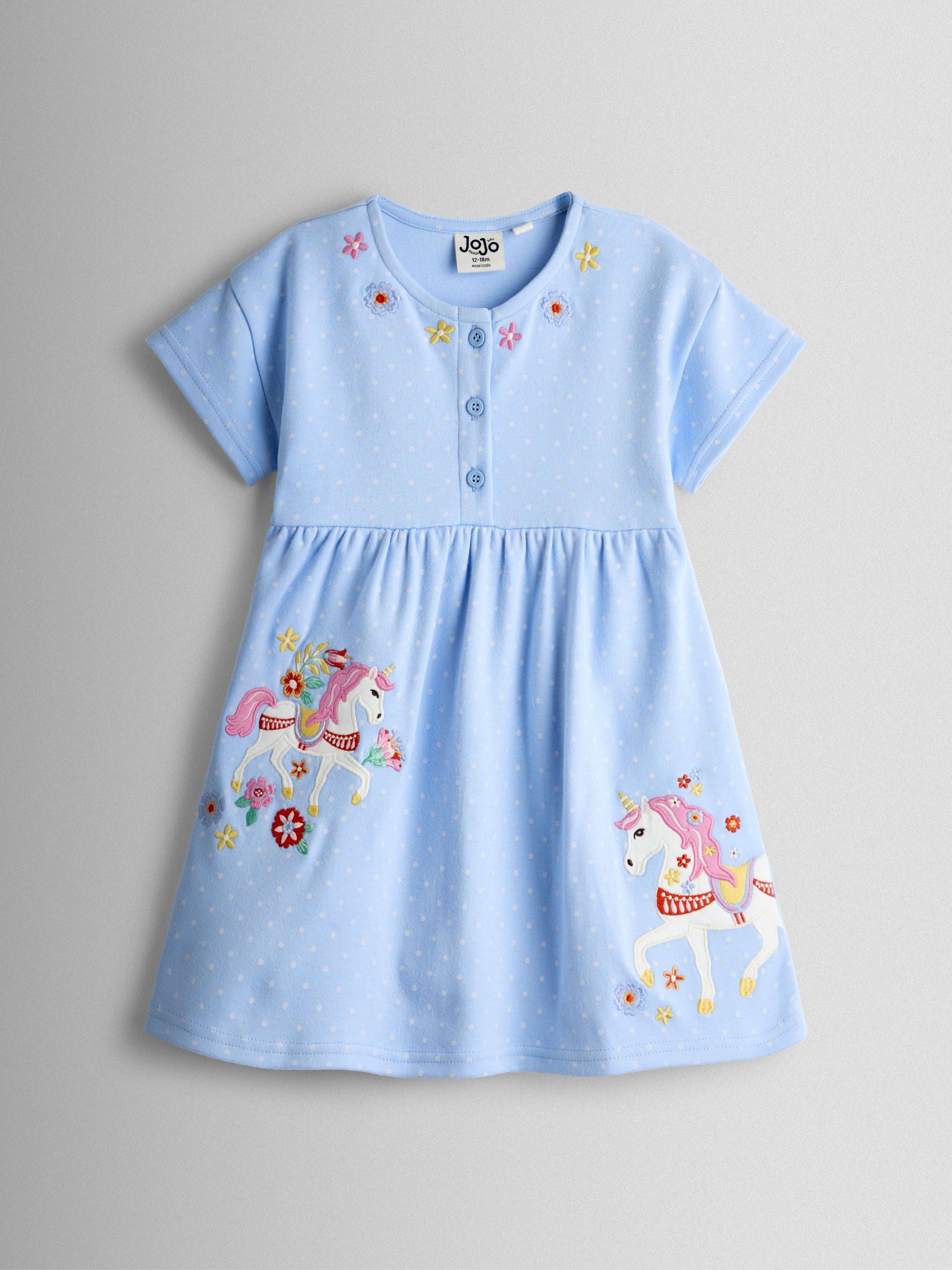 Cornflower Blue Unicorn Appliqué Drop Shoulder Button Front Dress