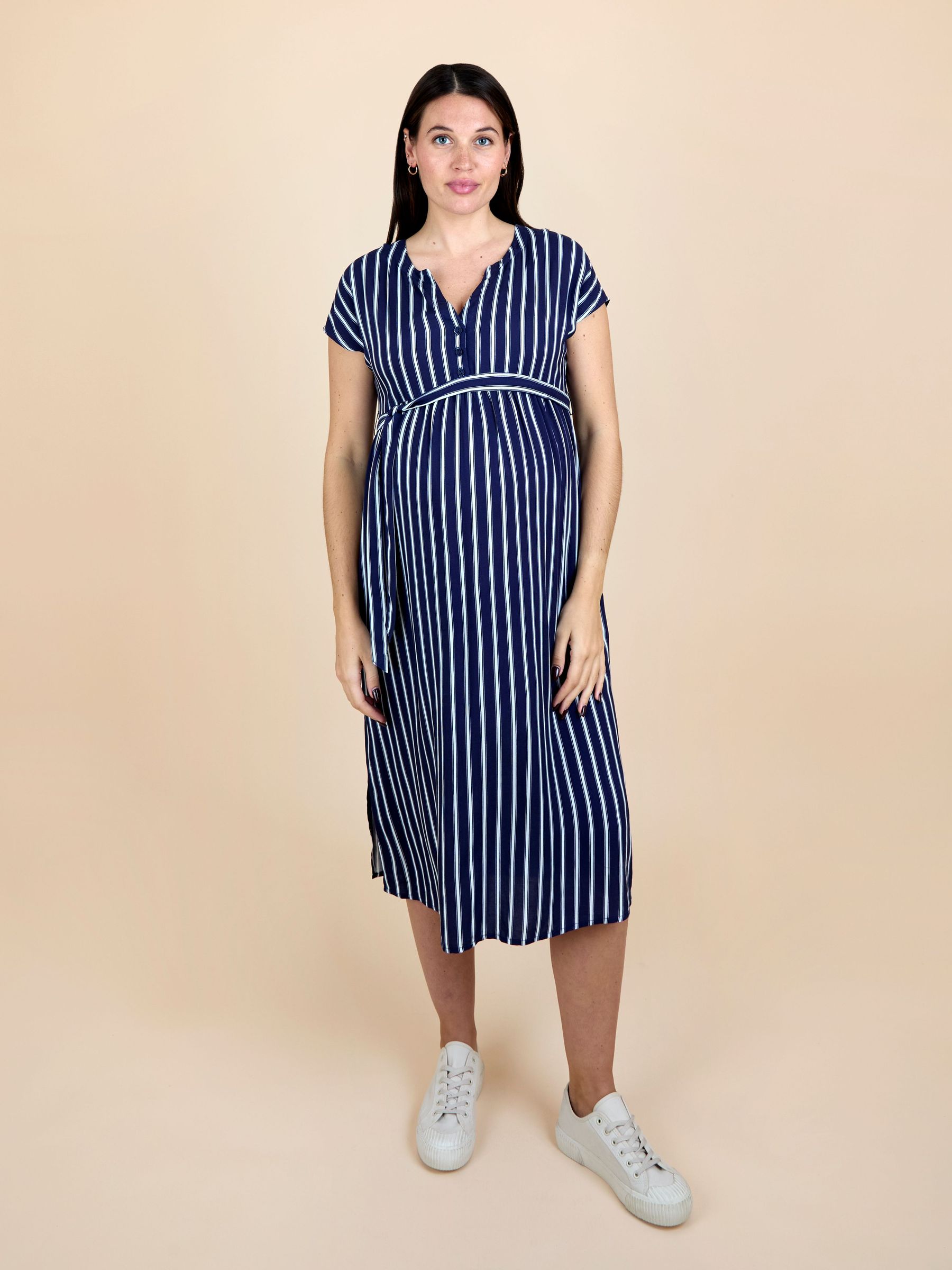 Black Cream Stripe Button Front Maternity Midi Dress