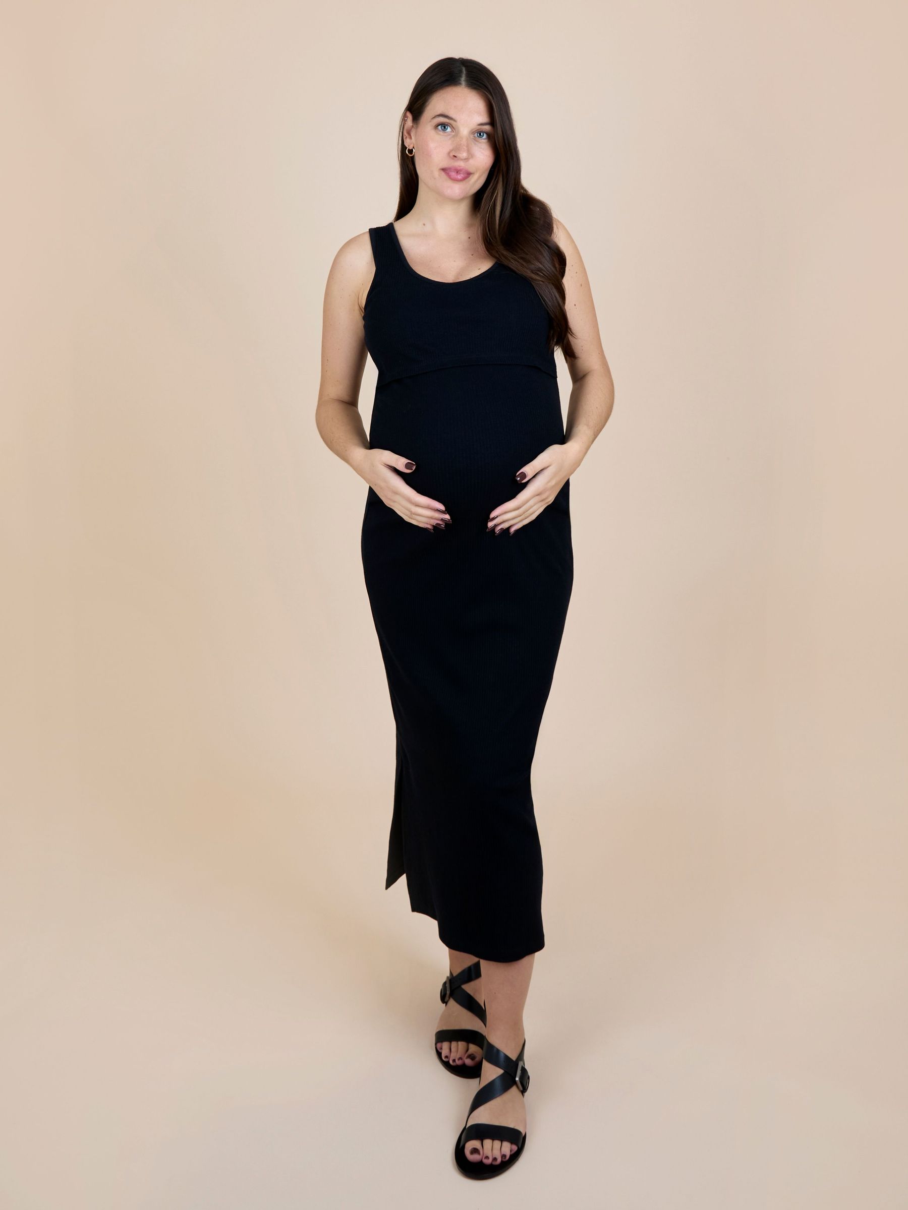 Black Sleeveless Ribbed Scoop Neck Midi Nursing Dress