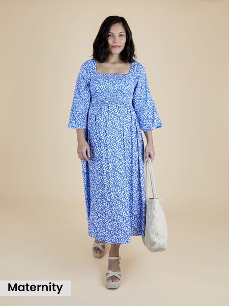 Blue Mid Puff Sleeve Printed Jersey Nursing Midi Dress