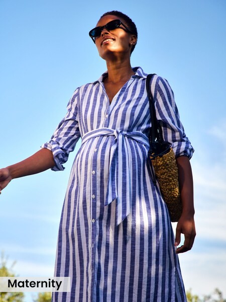Bright Blue Stripe Long Sleeve Maternity Shirt Midi Dress