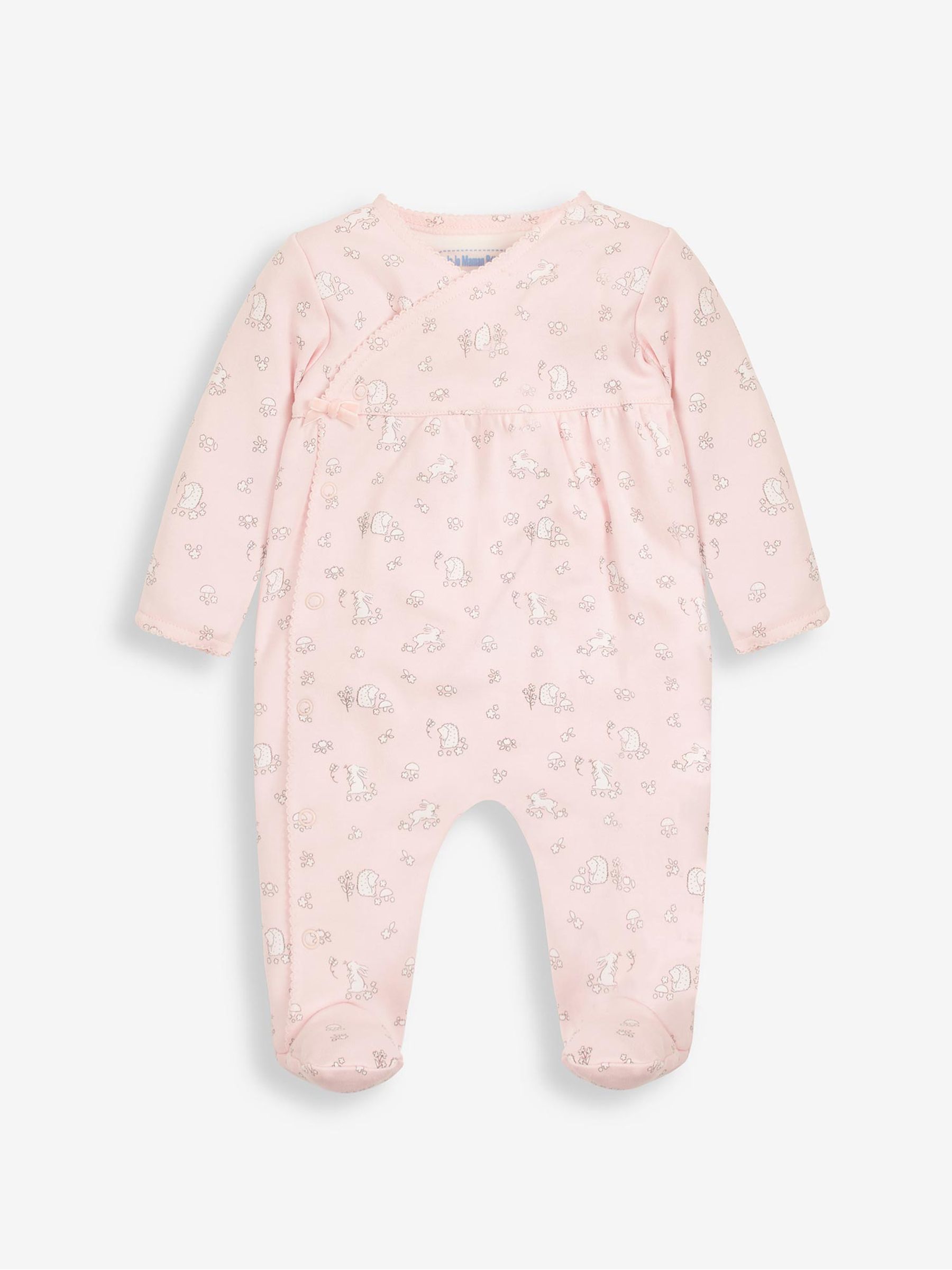 Featuring a wrap style, sweet bow detail, and picot trim, our Pink Bunny Print Pretty Sleepsuit offers an extra cute take on our regular sleepsuits. Made from soft cotton and built-in scratch cuffs for smaller sizes to ensure they are always protected; our sleepsuits are gentle on delicate skin. This is a lovely everyday outfit for your baby this season. All-over bunny print Wrap style Picot trim Bow detail to the side Feature anti-slip dots on feet Popper side and leg openings for easy changing Fold over scratch cuffs up to size 9-12 months Coordinate with Bunny Print Baby Hat, search ref D51871 KEEP AWAY FROM FIRE 100% Cotton Machine washable Warning: Keep away from fire and flames.