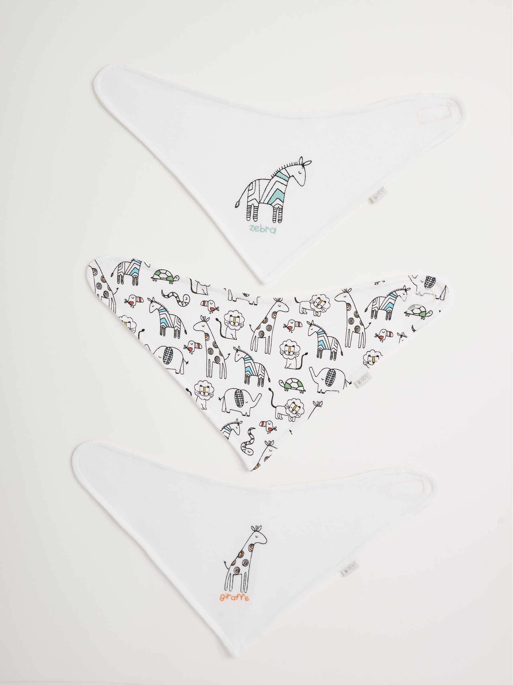 An essential set of white safari-themed dribble bibs to accessorise little outfits. Each set contains one giraffe bib, one all-over safari animal print bib and one zebra bib. Coming in a trendy neckerchief style and made from soft cotton jersey, they're practical, stylish and comfortable, and have been designed to match our White Safari Print Baby Sleepsuit.