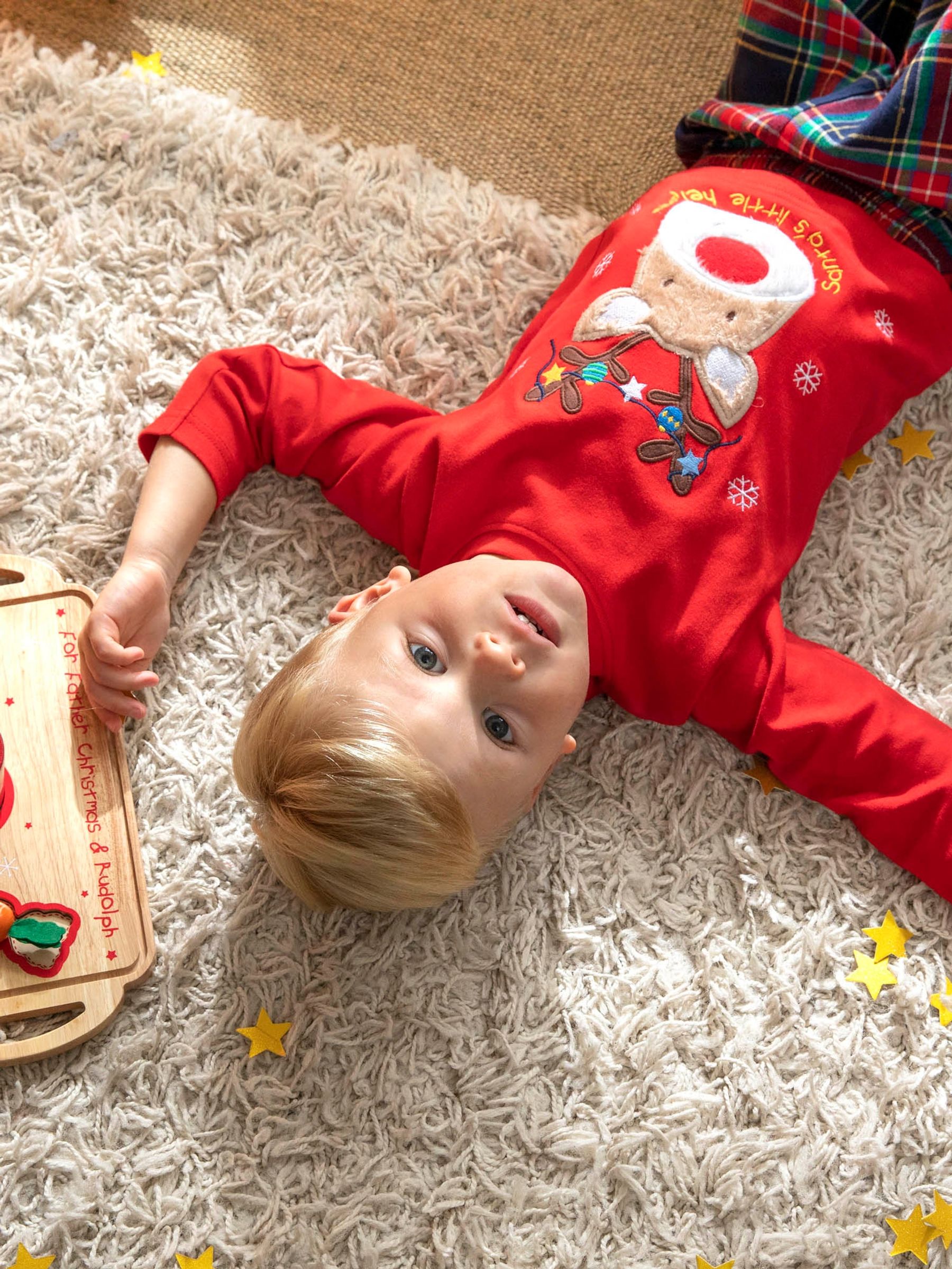 Make the nights before Christmas even more fun with these brilliant pyjamas. Featuring classic check bottoms for a traditional look and a bold reindeer appliqué with ‘Santa’s little helper’ lettering, our Red Reindeer Tartan Pyjamas are an easy way to get excited children into bed! Reindeer appliqué to the front of the top Classic check bottoms Elasticated waist for stretch and comfort Natural cotton to keep skin cool & comfortable Round ribbed neck Long sleeves Front panel lined in cotton to avoid irritating sensitive skin KEEP AWAY FROM FIRE Please note: appliqué stitching may vary 100% Cotton Warning: Keep away from fire and flames.