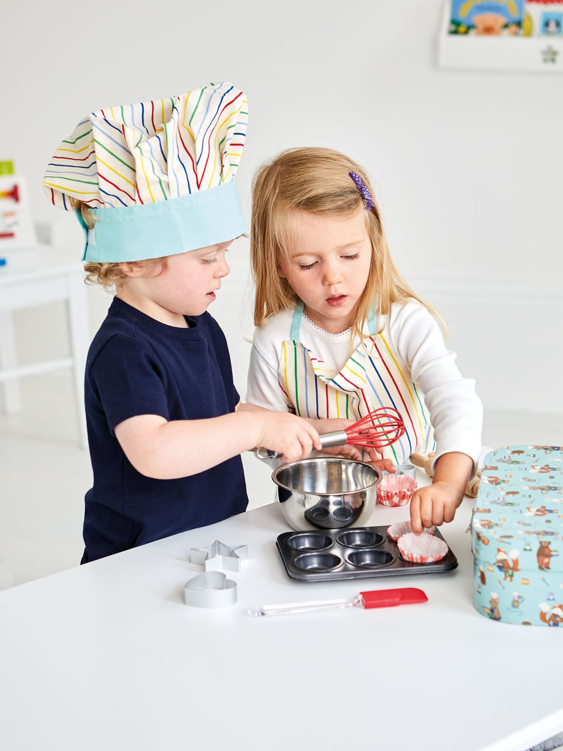 If you know a little one who's a future star baker, the Baking Set is the perfect gift for them. Inside the sweet baking set for kids case, you'll find a cupcake tray and liners, a mixing bowl, a wooden rolling pin, a spatula, a whisk, a wooden spoon, and 3 cookie cutters in the shape of a heart, gingerbread man, and star. When the child has the matching hat and apron on, they're the boss! 12-piece baking play set includes 1 cupcake tray, liners, a mixing bowl, a wooden rolling pin, a spatula, a whisk, a wooden spoon, and 3 cookie cutters All fits neatly inside a carry case Cupcake tray is oven safe up to 220°C Warning! To be used under direct supervision of an adult at all times Baking set: Stainless steel, aluminium, iron, birch wood, polystyrene, silicone, paper Case: Cardboard Apron and Hat: 65% Polyester, 35% Cotton Muffin tin measures 26.5 x 18.5cm Suitable from 3 years