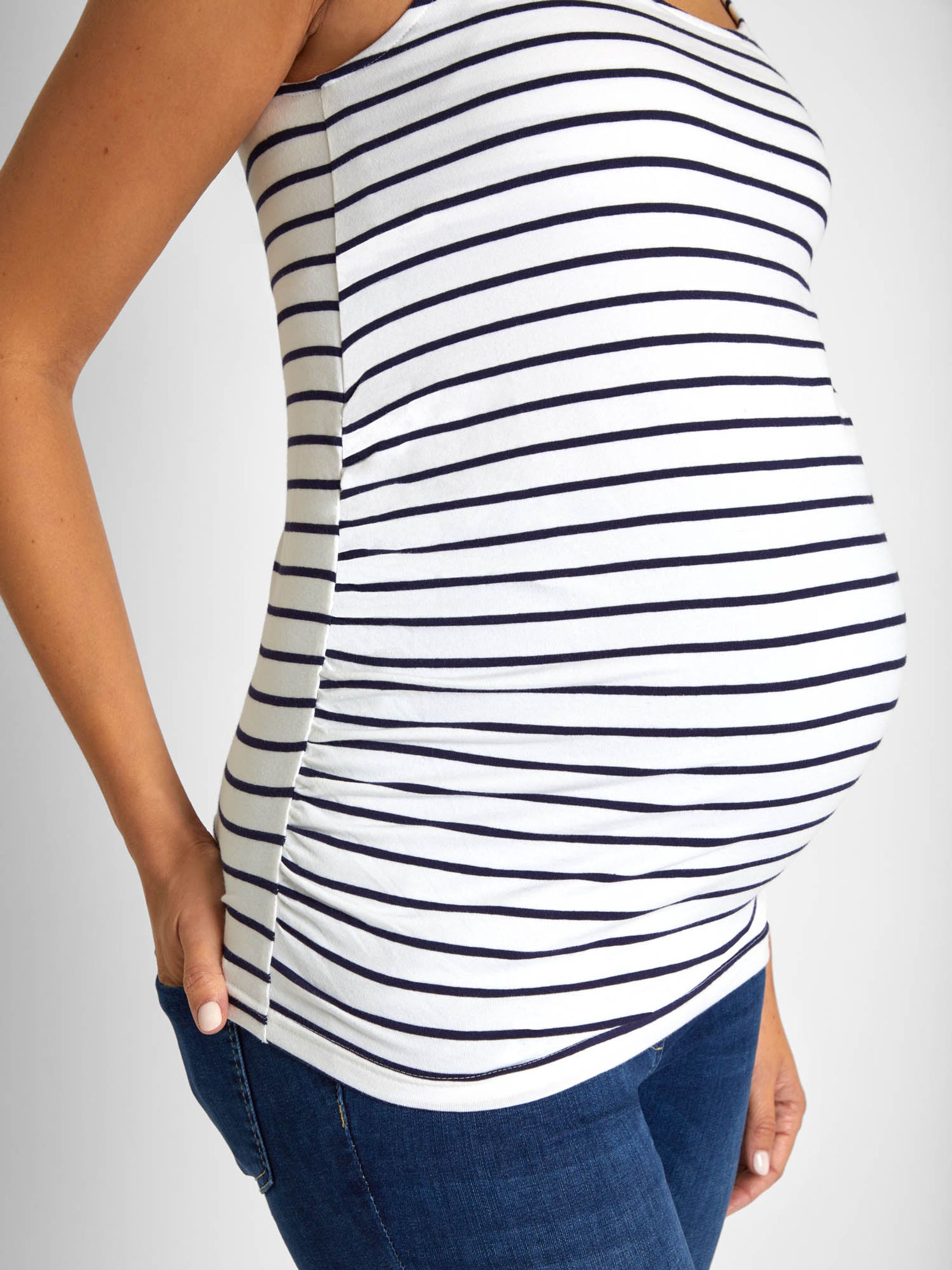 Throughout your pregnancy, these 2-pack White and navy stripes and Navy Ruched Maternity Vest Tops are a must-have basic. With ruched side stitching, these tops create a flattering gathering as your bump grows. The stripe print and navy are ideal for pairing with trainers and sandals during the summer, as well as layering under jumpers during cool summer nights.