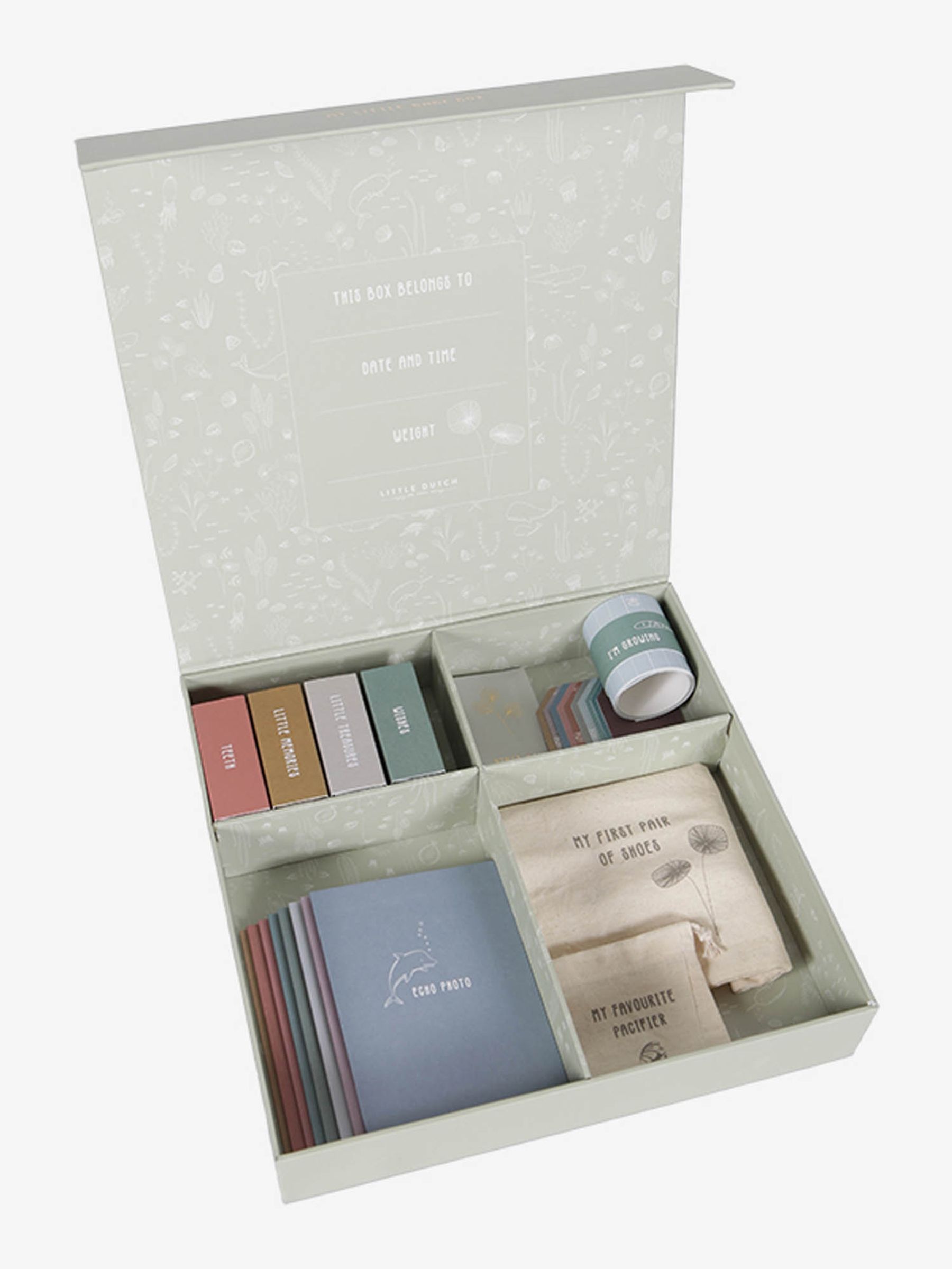 A beautiful way to treasure all the important steps of childhood, the Little Dutch Memory Box makes a wonderful gift for new parents. Record important milestones and keepsakes in a personal and creative way. Seal an envelope for the first lock of hair, a cotton bag for the first pair of shoes, small boxes for first teeth and much more! As children grow older, this lovely keepsake kit will become a cherished bonding experience to look back on with their parents – keeping everything close for a lifetime of happy memories. Envelope for the first lock of hair Cotton bag for the first pair of shoes Cotton bag for the favourite dummy Small boxes for the first teeth, for wishes, memories and treasures Tape measure to keep track of the child's growth Cards for ultrasound pictures, for prints of the feet and hands, for baby's first words and pictures/notes/thoughts you want to remember Labels to attach to the child's hospital name tag, their favourite cuddly toy and clothes, and blank labels to tie to other special objects Composition: Cardboard, Paper, Cotton 30 x 30 x 6cm