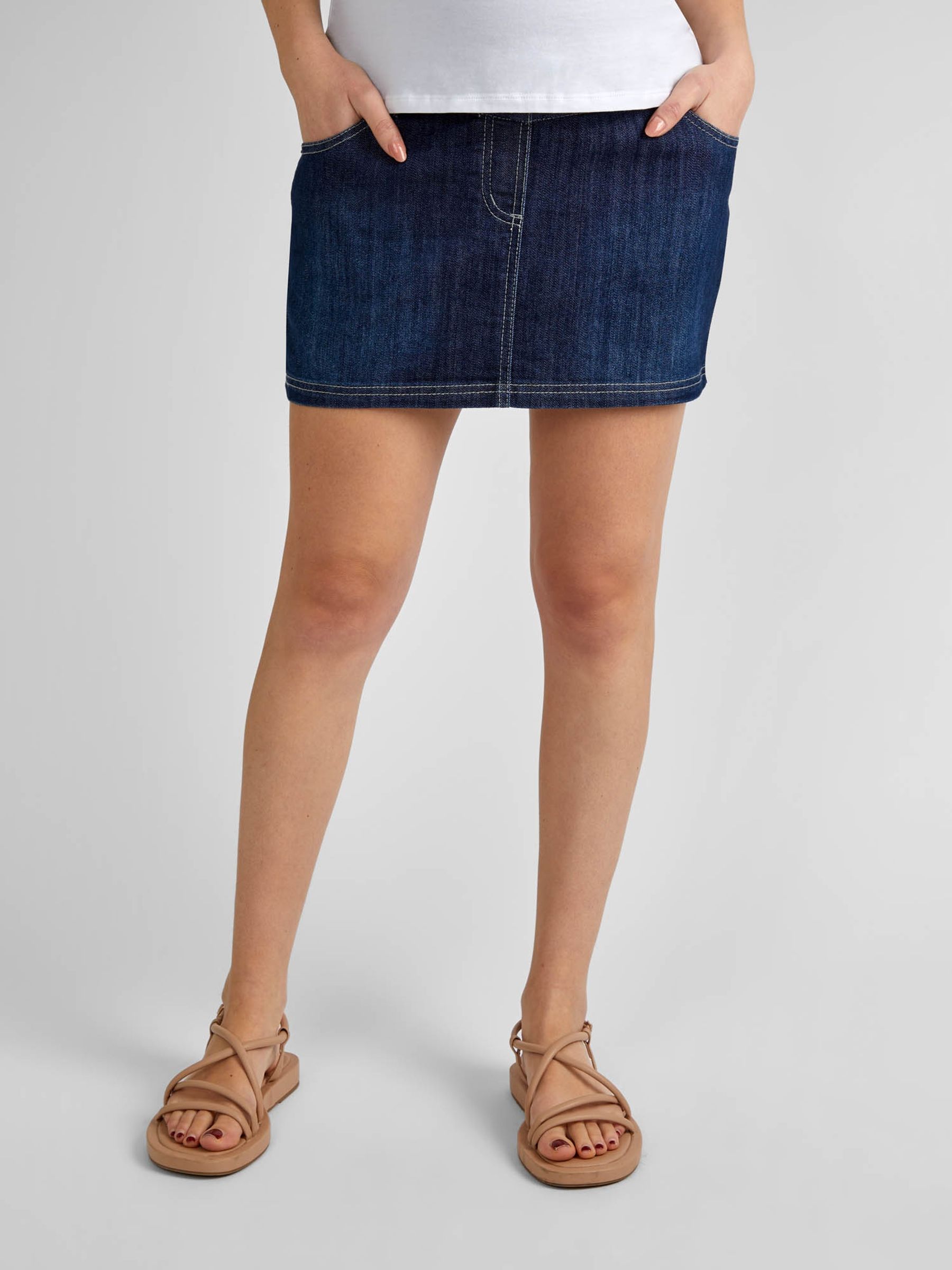 Complete your maternity wardrobe with a denim skirt. Authentic styling such as the contrast stitch, front and back pockets, and a mock fly build the classic look. Wear the wide jersey waistband under your bump for extra support or over for extra warmth or modesty.