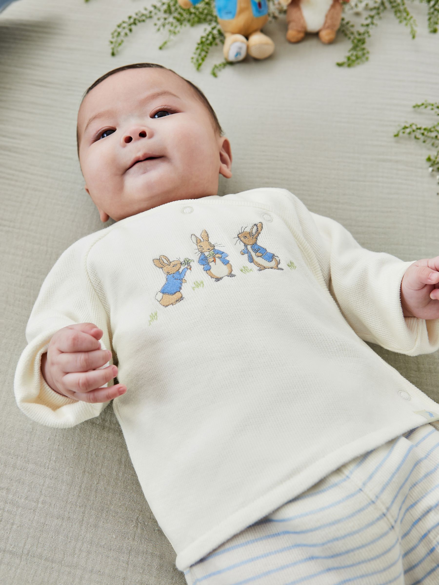 This adorable Peter Rabbit baby set is made from soft cotton, meaning it will be both comfortable and breathable all day. Spot one of the most popular scenes, Peter with all his friends! The 2-piece set includes an appliqué wrap top and cosy trousers Elasticated waist for stretch and comfort Long sleeves 100% Cotton Machine washable This product is made with 100% BCI cotton, which promotes sustainable standards in cotton farming