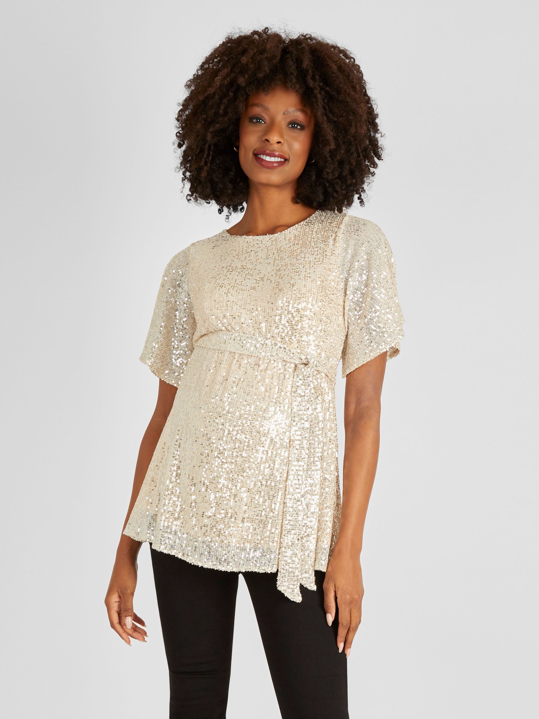 Feel bright and beautiful in our Sequin Maternity Top. Perfect for the Christmas party season, the all-over sequins shine bright in any room. Flutter sleeves, an empire seam, and a waist tie mean you can fit and style the top to your changing pregnancy body and always end up with a flattering silhouette. The Sequin Maternity Top is longer on the body too, so you won’t have to worry about any gapping between your clothes. Designed to fit throughout pregnancy All over sequin Gathers at Empire Seam Flutter sleeves Waist tie to flatter your changing shape Champagne MAIN: 100% Polyester LINING: 95% Polyester, 5% Elastane Knitted MACHINE WASH AT 30° Machine washable