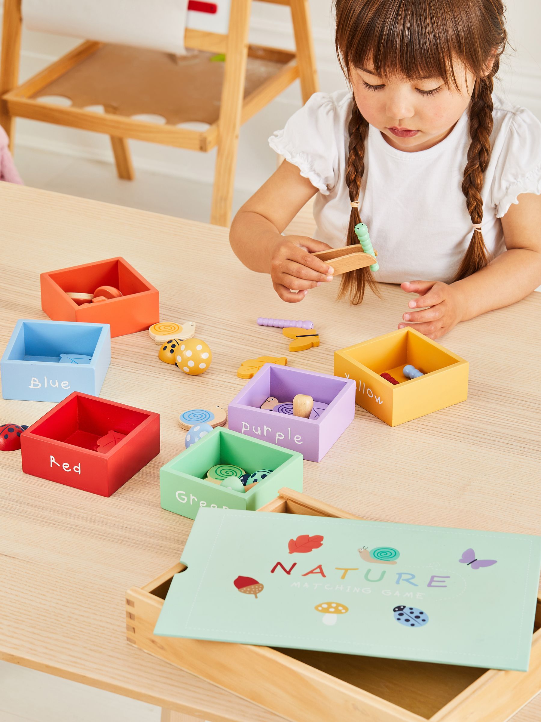 Watch children pair colours, shapes, and animals together with our Nature Matching Game. Designed to build fine motor skills, match the beautiful shapes with the wooden tongs and help little ones recognise what they've seen outdoors in a controlled setting. All contents pack away into the wooden outer case, perfect for storage.