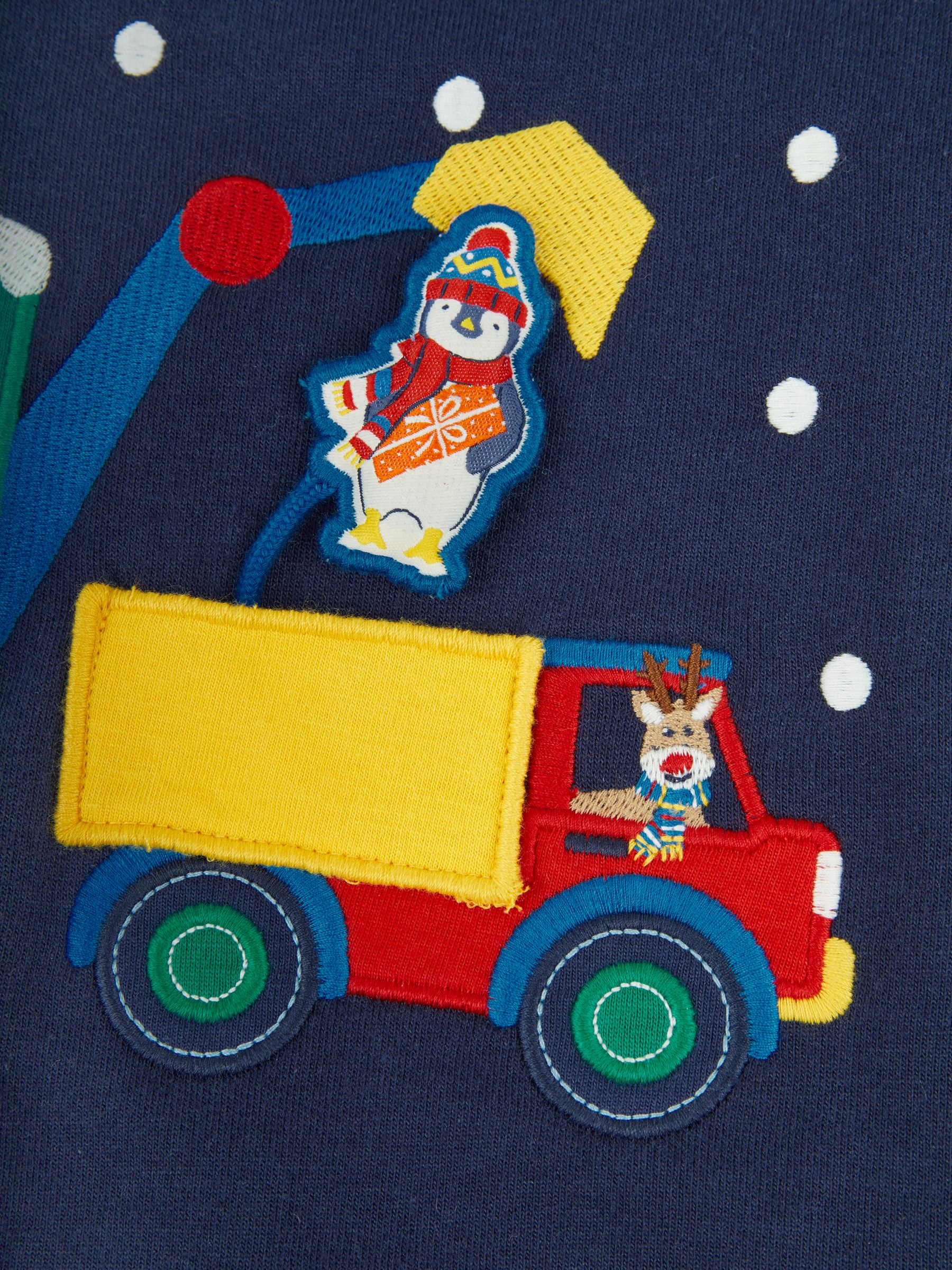 A winter wardrobe wouldn't be complete without a Christmas sweatshirt, and this fun navy blue santa version offers an adorable layer to your child's look. Made with super soft brushed fleece fabric, this one is a lovely option for colder days this festive season. Santa Digger appliqué to the front Front panel lined in cotton to avoid irritating sensitive skin Round neck Button neck opening for easy dressing Long sleeves Ribbed neck, cuffs and hem Please note that appliqué stitching may vary This product is made with BCI cotton, which promotes sustainable standards in cotton farming 100% Cotton Machine washable 40 degrees