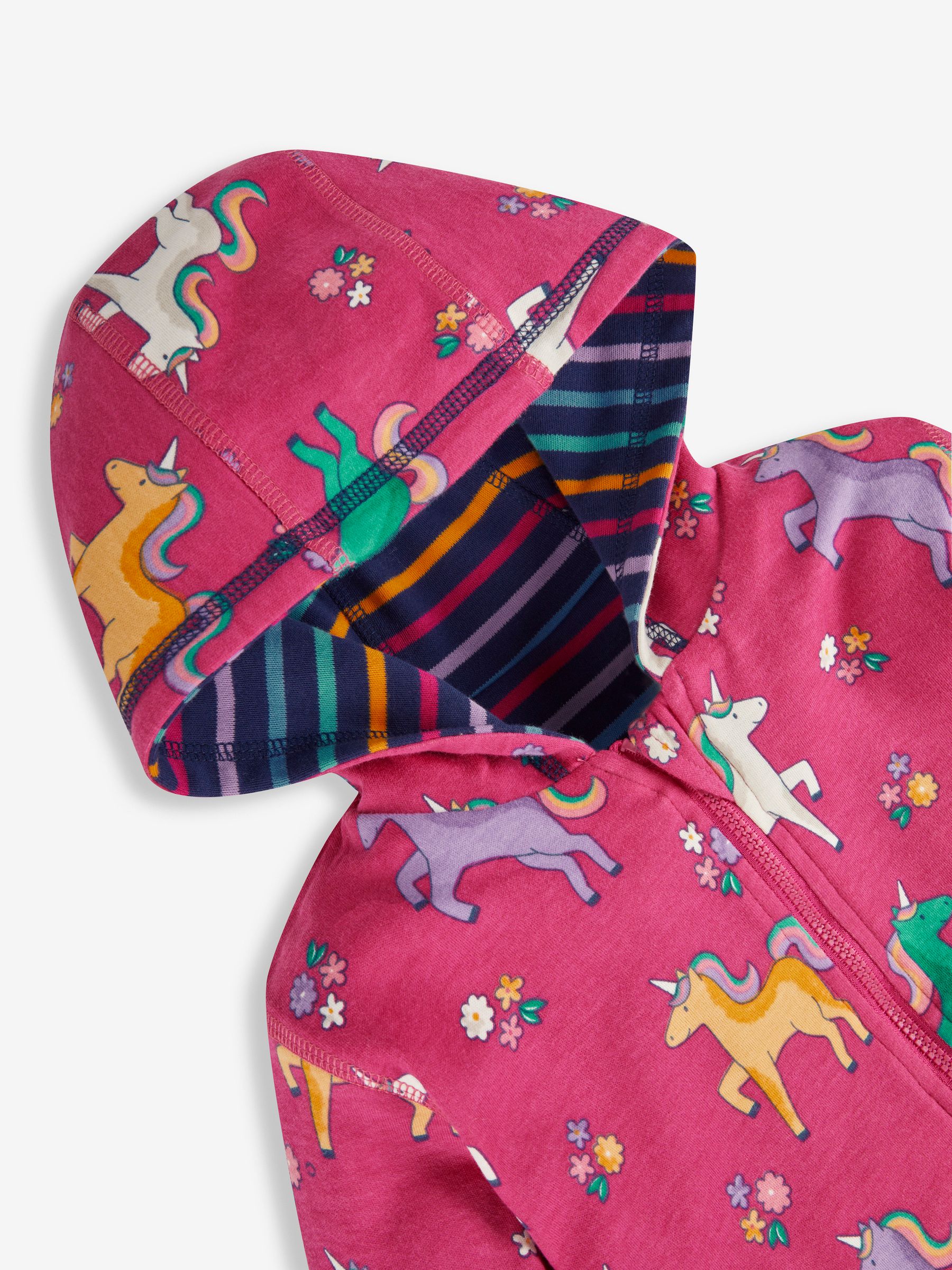 With 2 distinct looks in 1, reversible hoodies are one of our best sellers every season. This design features a cool unicorn print all over one side, and striped fabric on the other with large appliqués. It s perfect as a layer on cooler, casual days. Reversible 1 side unicorn print, 1 side multicoloured stripes with unicorn appliqué to front Pockets to printed side Pet in pocket attached to a string for safekeeping Zip front Long sleeves Please note that appliqué stitching may vary 100% Cotton Machine washable 40°