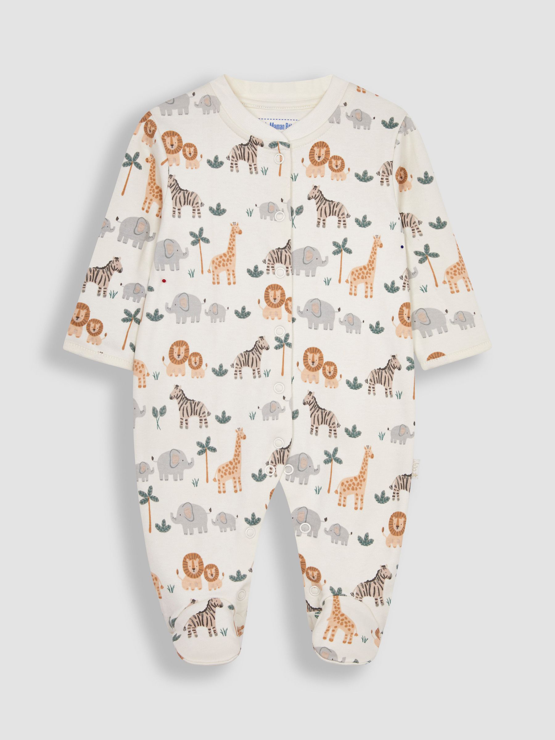 Make sure your little one is cosy all day long with our 2-piece Safari Sleepsuit & Jacket Set. The 2-piece includes a mocha brown jacket with an embroidered lion and zebra on two front pockets and an inner safari fabric. Coordinate the jacket with a matching cream popper sleepsuit with a gorgeous animal print. Layer the two together for an extra cosy outfit on colder days. This comfy sleepsuit won’t get in the way of naptime either. As always, our sleepsuit has been crafted from soft cotton and features built-in scratch cuffs on smaller sizes to ensure delicate skin is always protected. Baby will be sleeping in no time. The 2-piece set includes a cream safari sleepsuit and a soft quilted mocha brown baby jacket Reversible jacket: one side solid, one side print Popper front and leg openings for easy dressing Cosy rib neck and cuffs Fold over scratch cuffs up to size 9-12 months Sizes 9-12 months and up feature anti-slip dots on feet KEEP AWAY FROM FIRE MAIN 1: 100% Cotton MAIN 2: 80% Cotton, 20% Polyester LINING: 100% Cotton Machine washable Save £10.00* when buying 2 items from JoJo Maman Bebé Sleepsuits/Layette Range. * Saving applied will be apportioned across all qualifying items. To get the saving, you must order the qualifying items within the same order at the same time. If you later return one of the items, you will not be entitled to the discount. Offer applies to selected items at full price. Please refer to T&Cs for full details.