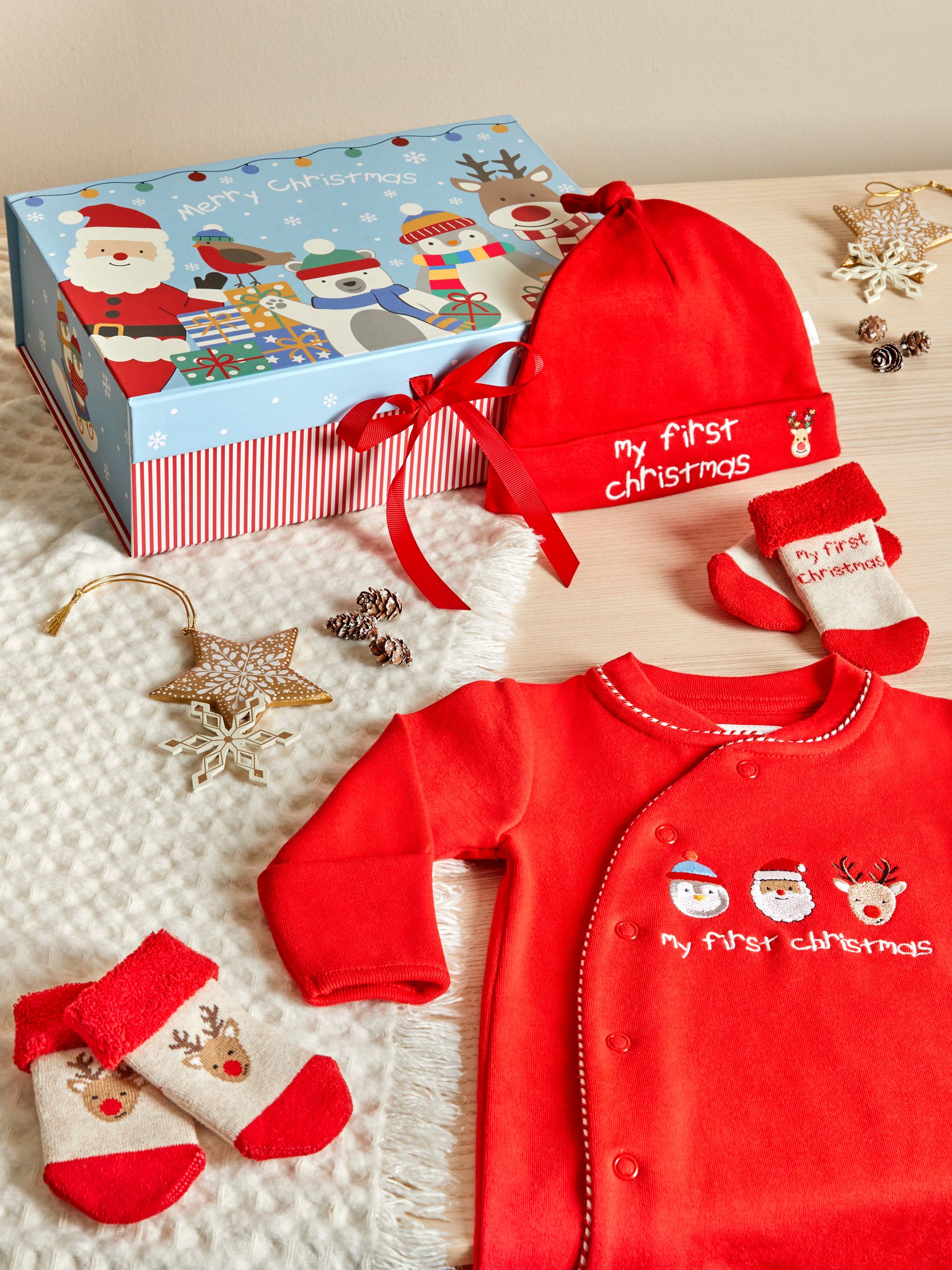 First Christmases are a special time for newborns, parents, and everyone in the family. Parents will definitely appreciate our My First Christmas Gift Set that’s sure to have any child ready for Santa Claus to visit! Featuring a bright red sleepsuit with a jolly snowman, reindeer, and Santa, a festive red hat, and adorable reindeer socks, babies will definitely be dressed for their first Christmas in style. It’s all presented in a suitably seasonal gift box complete with winter characters, and makes a lovely keepsake box for storing many memories. Sizing suitable for 0-3 months. Includes My 1st Christmas Sleepsuit (385084) Includes My 1st Christmas Hat (707142) Includes My 1st Christmas Socks (942113) Includes Medium Christmas Box (227460) All gift sets come beautifully packaged with tissue paper If, due to unforeseen circumstances, the gift box pictured or an included item is not available from this gift set, please note that we will replace it with something of a similar nature and value so that your order is not delayed. We cannot accept returns of individual items from gift sets. If you change your mind, please return the entire set in a re-sellable condition, including the gift box and tissue paper. Please note that original transit packaging and price labels will be removed from items in the gift box before packing to ensure the item is giftable. For additional T&Cs, read more on our FAQ section