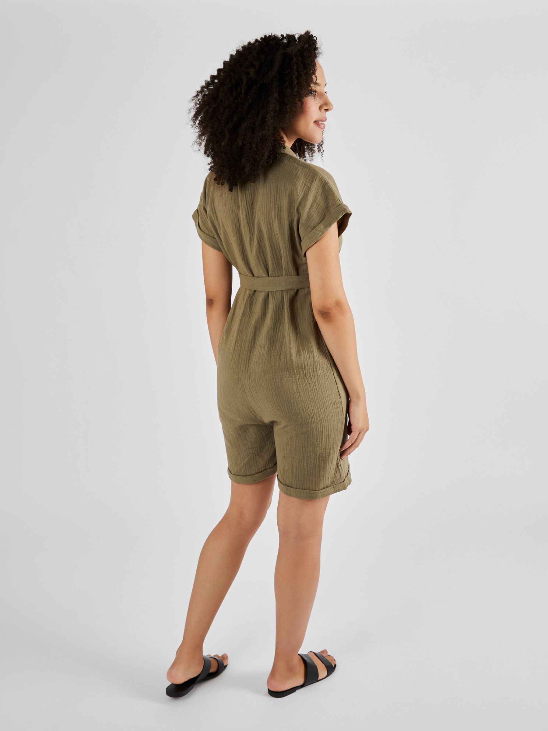 Feel cool in cotton with our new Cotton Maternity Playsuit outfit. Made out of cheesecloth fabric, the relaxed texture will always keep its shape, so you can wear it all day long and still look and feel smart. A Peter Pan collar, button fastening, and a belt tie elevate the casual playsuit into a fashionable statement piece. Pair the Cotton Maternity Playsuit with white trainers and large sunglasses for a sunny, summery look.