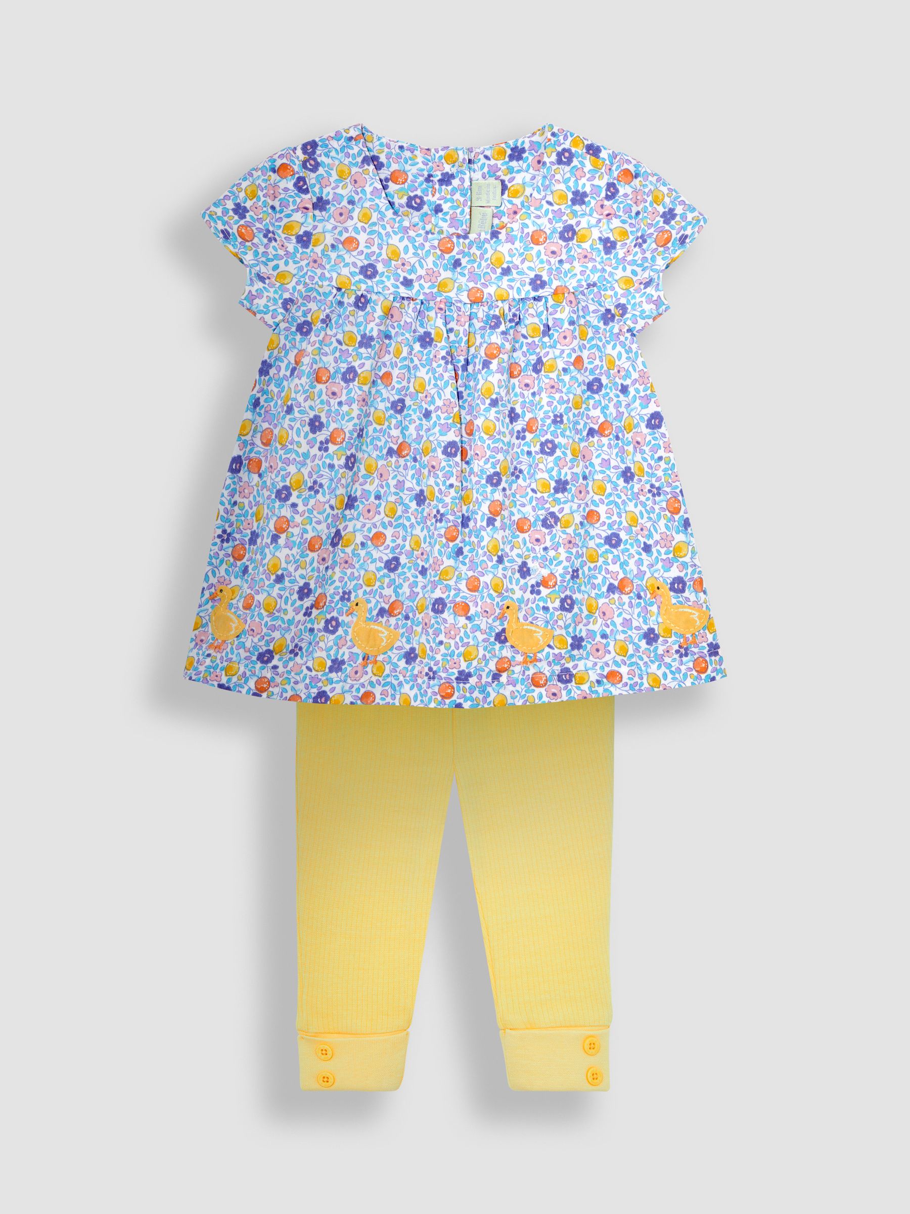 This cheerful lilac purple and yellow set will put a spring in little steps. Featuring appliqué ducks and a zesty all-over lemon print, it’s the perfect look for a warm sunny day. The floaty blouse has a handy button back for secure and quick dressing, while the bright leggings elasticated waistband ensures comfort all day.