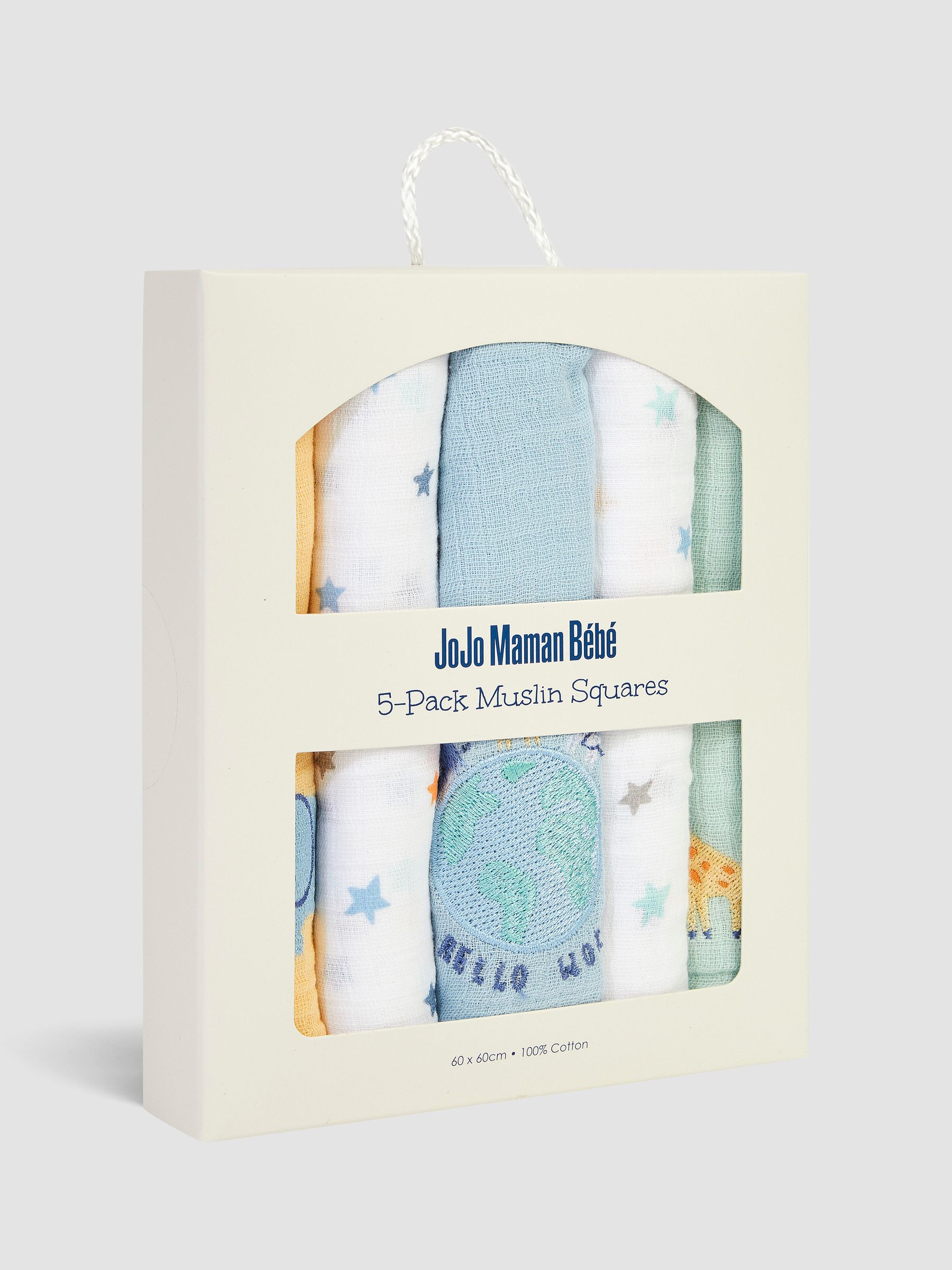 - 5-Pack set includes 2 all-over multicoloured dotted muslins, 1 yellow muslin with elephant design, 1 blue muslin with giraffe design, and 1 blue muslin with ''Hello World'' design