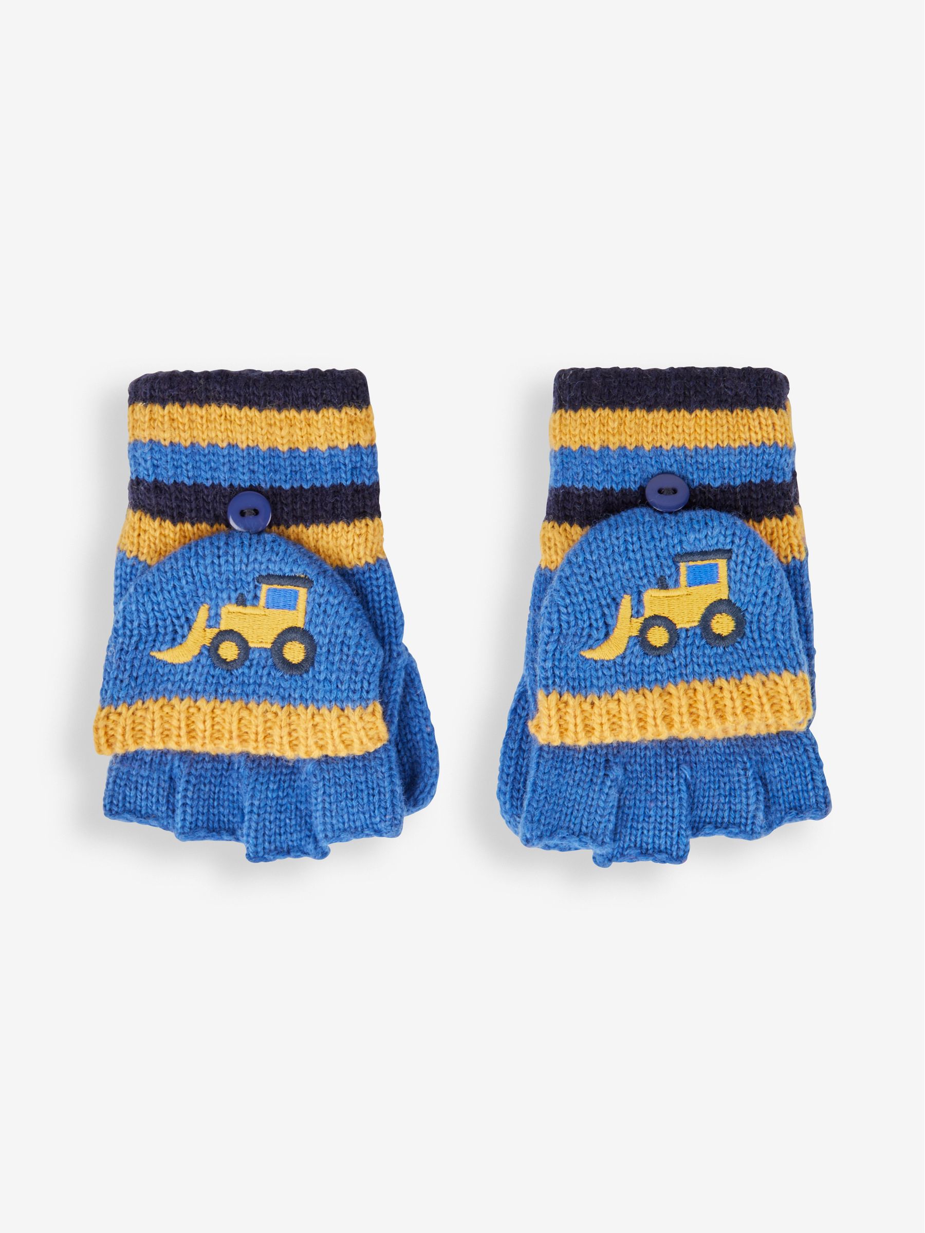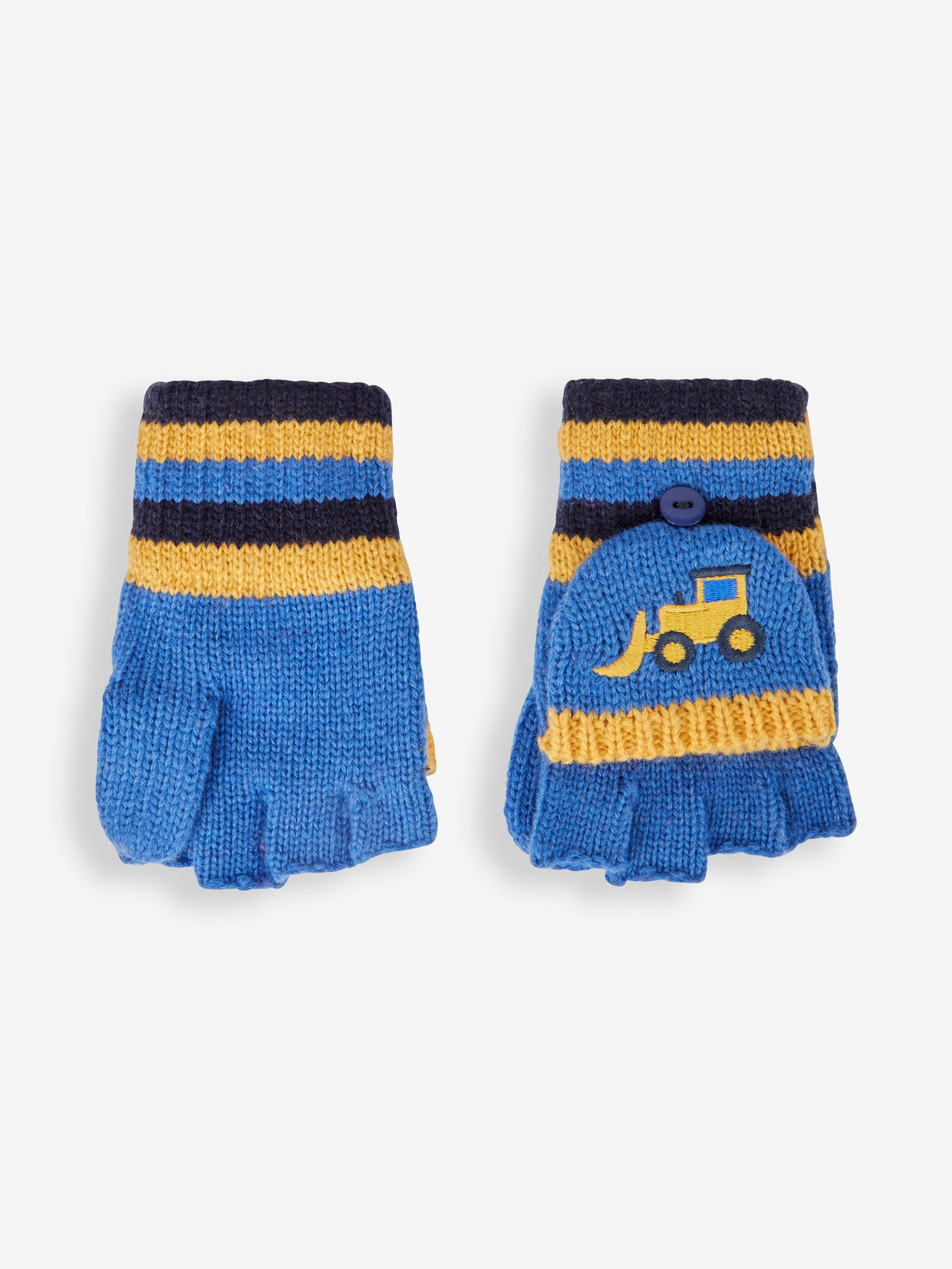 Spot the delightful digger embroidery on these sweet knitted gloves! As well as providing a fun picture on chilly days, the super cosy fabric will keep little hands warm. Children can wear them as mittens, or if your little one prefers, the gloves can be fastened back to convert them into fingerless gloves. Rib cuffs ensure the mittens stay on, while the flexible fit means they're comfy to wear.
