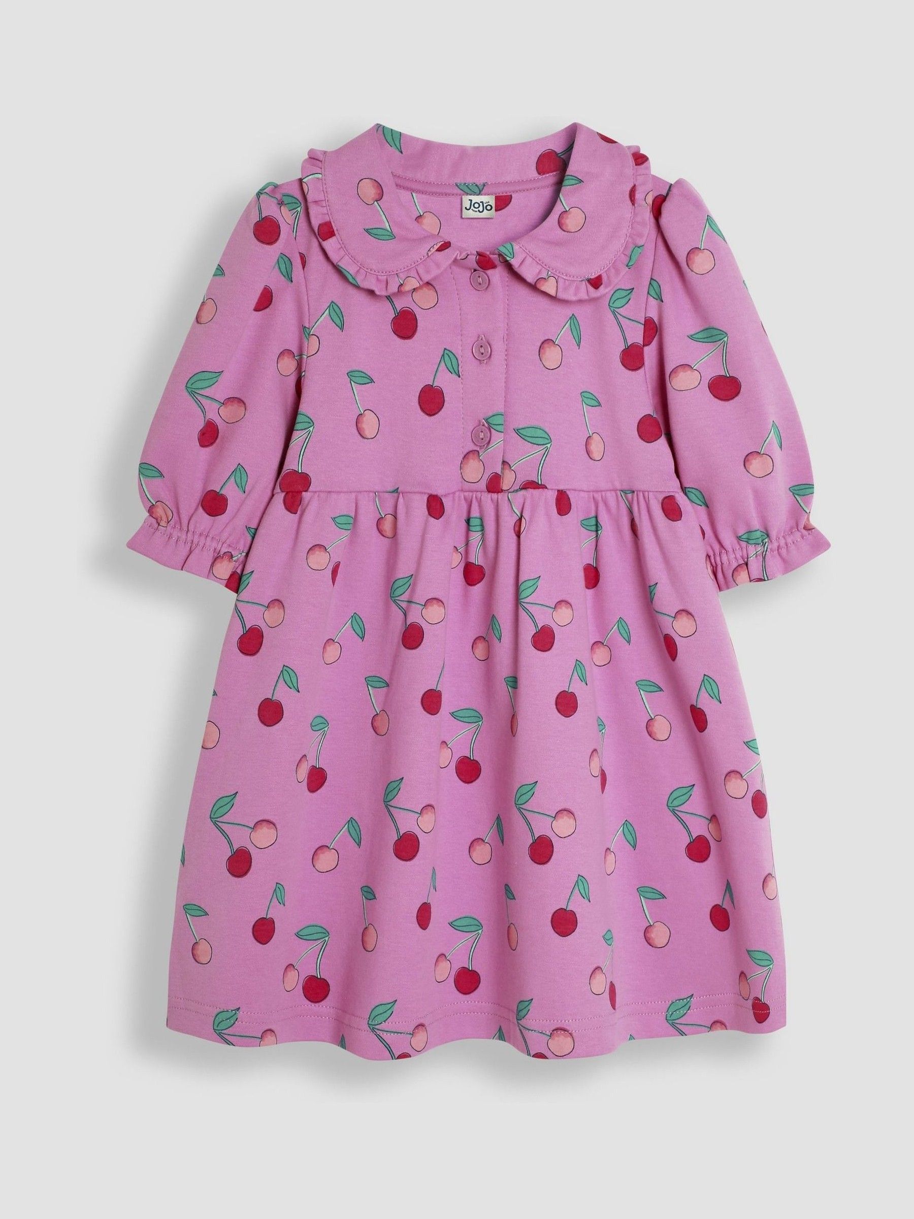 Made for berry sweet dressing, this Cherry Peter Pan Dress showcases traditional British style at its best. Multicoloured cherries sit atop an orchid-pink jersey dress. And with a crisp Peter Pan collar that blends into the dress, it's easy to keep looking cool Add cream tights and Mary Jane leather shoes for party-ready days.