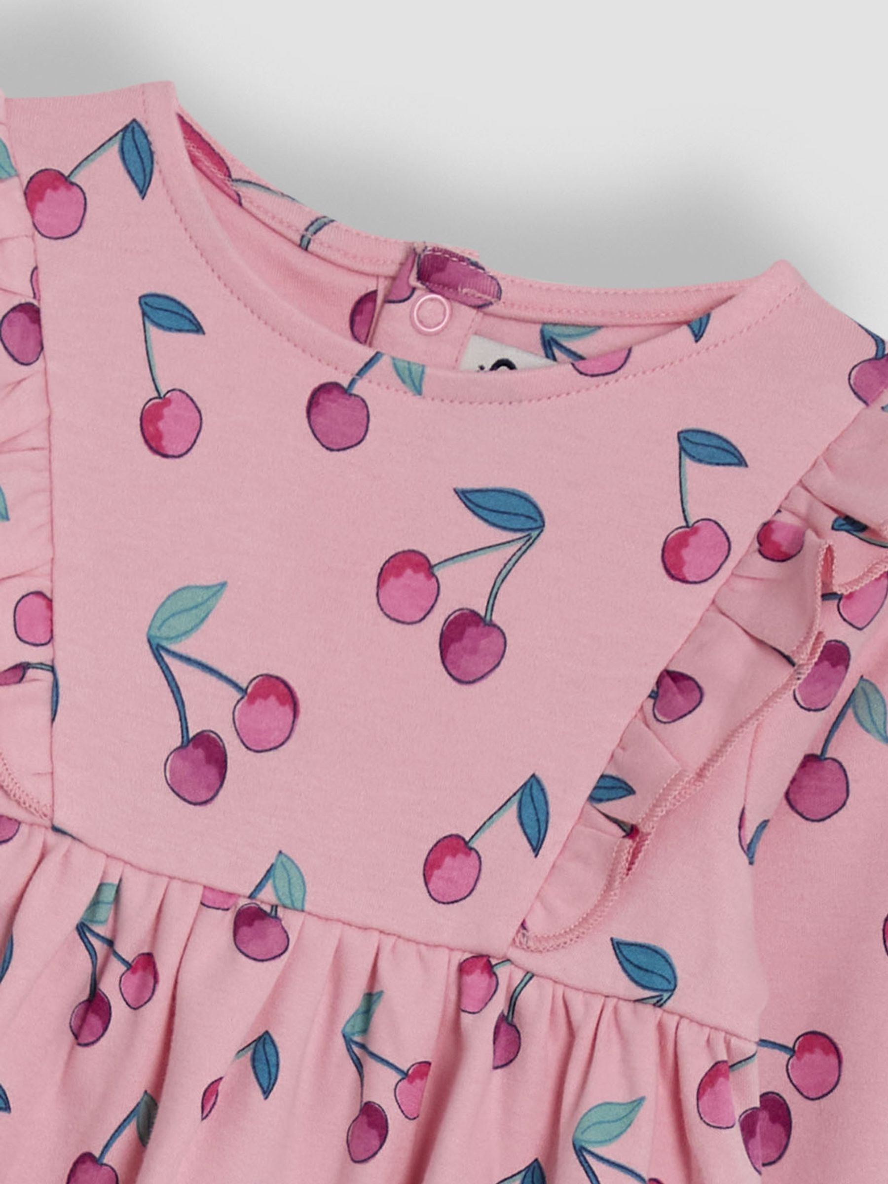Full-swing spring days are here, so dress for petal-picking and picnicking with this Cherry Frill Sleeve Rib Dress. Complete with a scattered cherry print all over, this dress is bursting with sweetness. The frilled sleeve details just add to the undeniable charm of this piece, not to mention its stretchy ribbed feel makes it oh-so comfy for everyday adventures. Pink rib jersey dress Long sleeves Round neckline Frilled detailing Red cherry print all over Machine washable