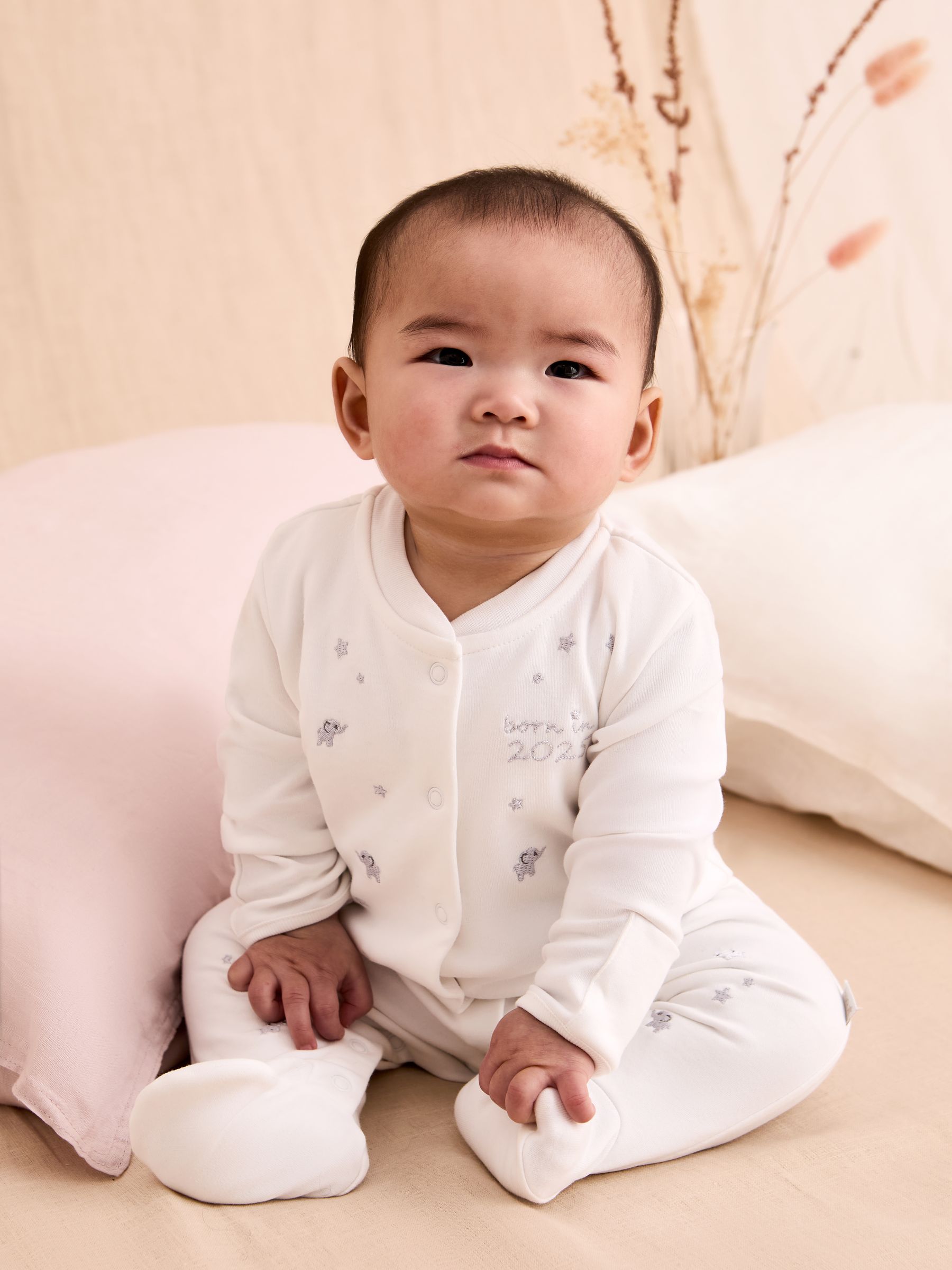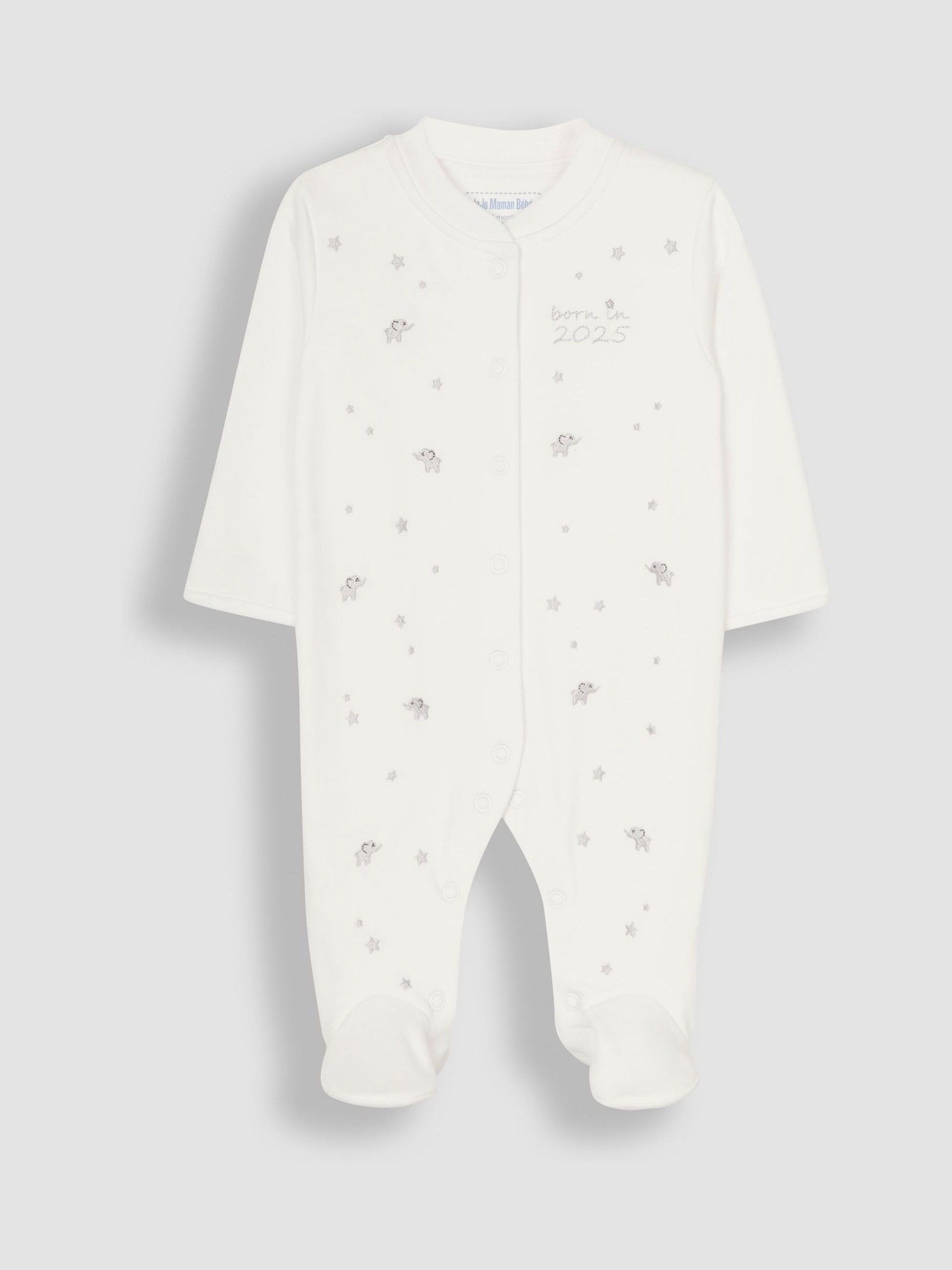 Welcome your little star with our Born in 2025 Embroidered Sleepsuit. Crafted from crisp white cotton and adorned with “Born in 2025” in shimmering silver thread, this sleepsuit is as charming as it gets. The delightful star and elephant print adds a touch of whimsy, making it an ideal unisex gift for baby boys and girls alike, especially when the gender is still a surprise! Pair it with the matching Born in 2025 Hat and socks for an adorable coming-home outfit. All-over star and elephant embroidery Supersoft touch Popper front and leg openings for easy dressing Fold over scratch cuffs 100% Cotton Machine washable Save £10.00* when buying 2 items from JoJo Maman Bebé Sleepsuits/Layette Range. * Saving applied will be apportioned across all qualifying items. To get the saving, you must order the qualifying items within the same order at the same time. If you later return one of the items, you will not be entitled to the discount. Offer applies to selected items at full price. Please refer to T&Cs for full details. Warning: Keep away from fire and flames.
