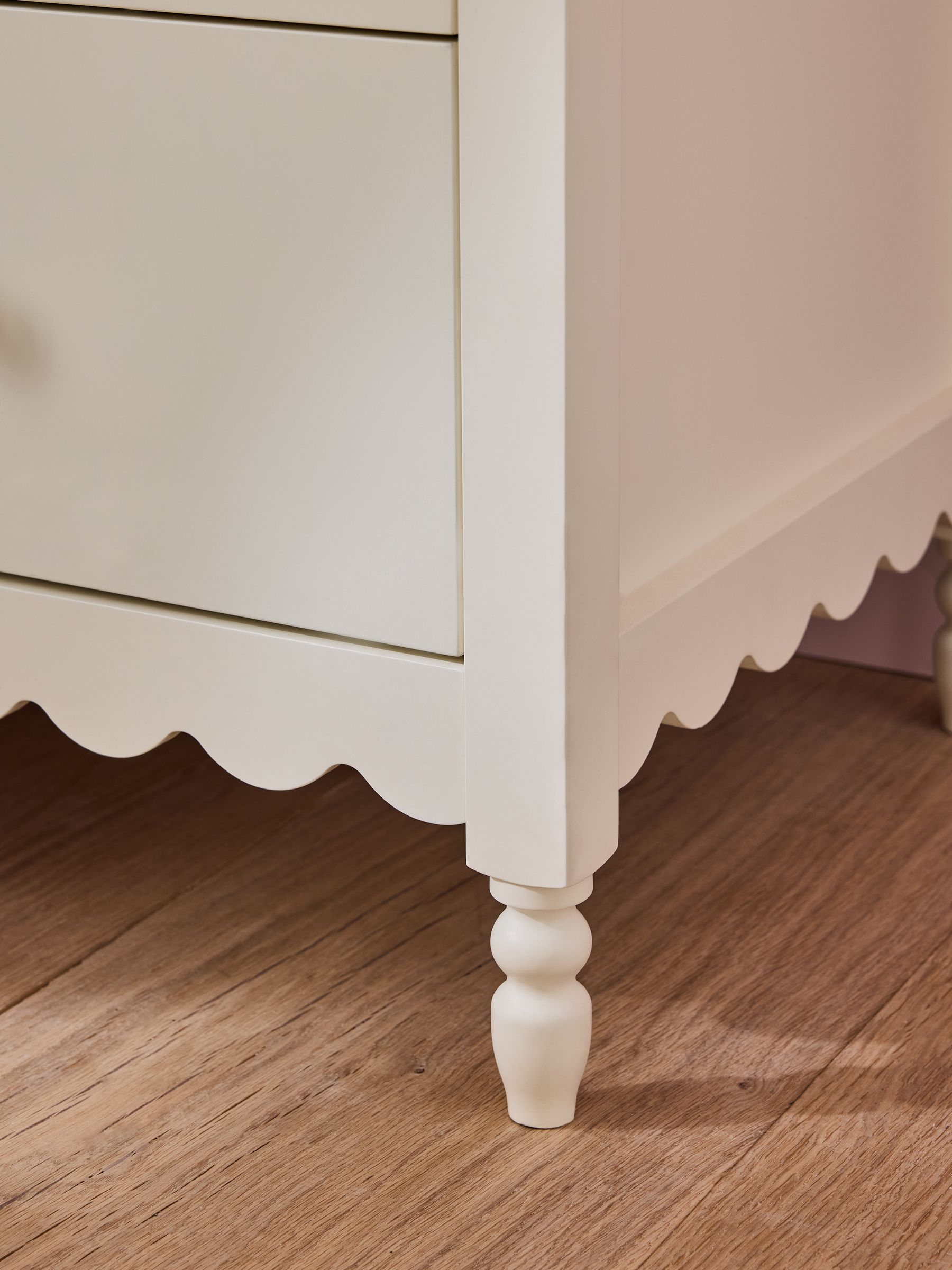 White painted furniture with scallop detailing. Changing table removable. Height 93cm Width 96.5cm Depth 53cm Multibuy: Save 10% when buying 2 or more items each priced at £150 or above across selected Sofas, Chairs, Rugs, Beds, Mattresses and Furniture Collections. Multibuy is only applicable to the UK Mainland Area.* Condition: * Saving applied will be apportioned across all qualifying items. To get the saving, you must order the qualifying items in the same order at the same time. If you later return one of the items, you will not be entitled to the discount. Offer applies to selected items at full price. Please refer to T&Cs for full details. This product requires self-assembly. Regrettably, self-assembly items cannot be returned once assembly is part or fully completed, unless they do not comply with the description given, are faulty, or are not fit for any stated purpose. Your statutory rights are not affected.