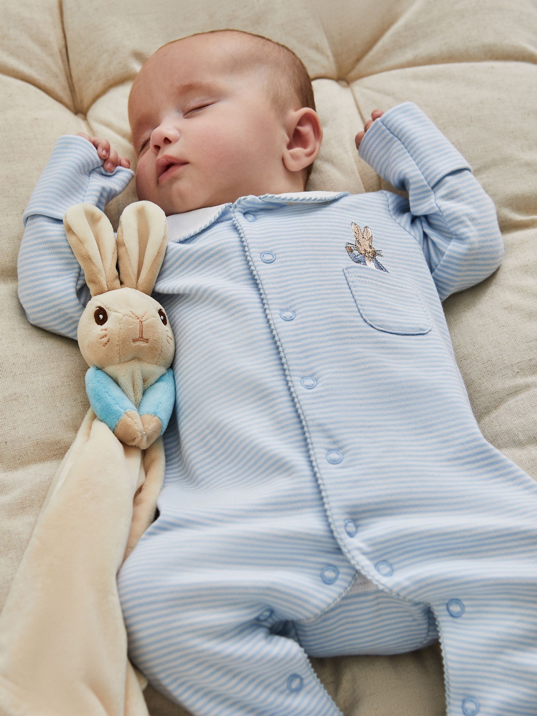 Introduce newborns to Beatrix Potter’s timeless characters with our Peter Rabbit™ Sleepsuit And Comforter Gift Set. Any little one will be ready for the day when they wear this charming outfit; a super soft pale blue and white sleepsuit with a Peter Pan collar and a sweet Peter peeking out of a chest pocket. A coordinating Peter Rabbit comforter will accompany your child wherever they go. Ideal for a newborn baby, or to add an occasion sleepsuit to a baby’s wardrobe. Includes Peter Rabbit Sleepsuit and Peter Rabbit Comforter. Based on Beatrix Potter character. Super soft touch. Popper fastening can be opened from the top or bottom for easy changing. Fold-over scratch cuffs up to size 9-12 months. MAIN 1: 80% Cotton, 20% Polyester. MAIN 2: 100% Cotton. LINING: 100% Cotton. KEEP AWAY FROM FIRE. Machine washable. Warning: Keep away from fire and flames.