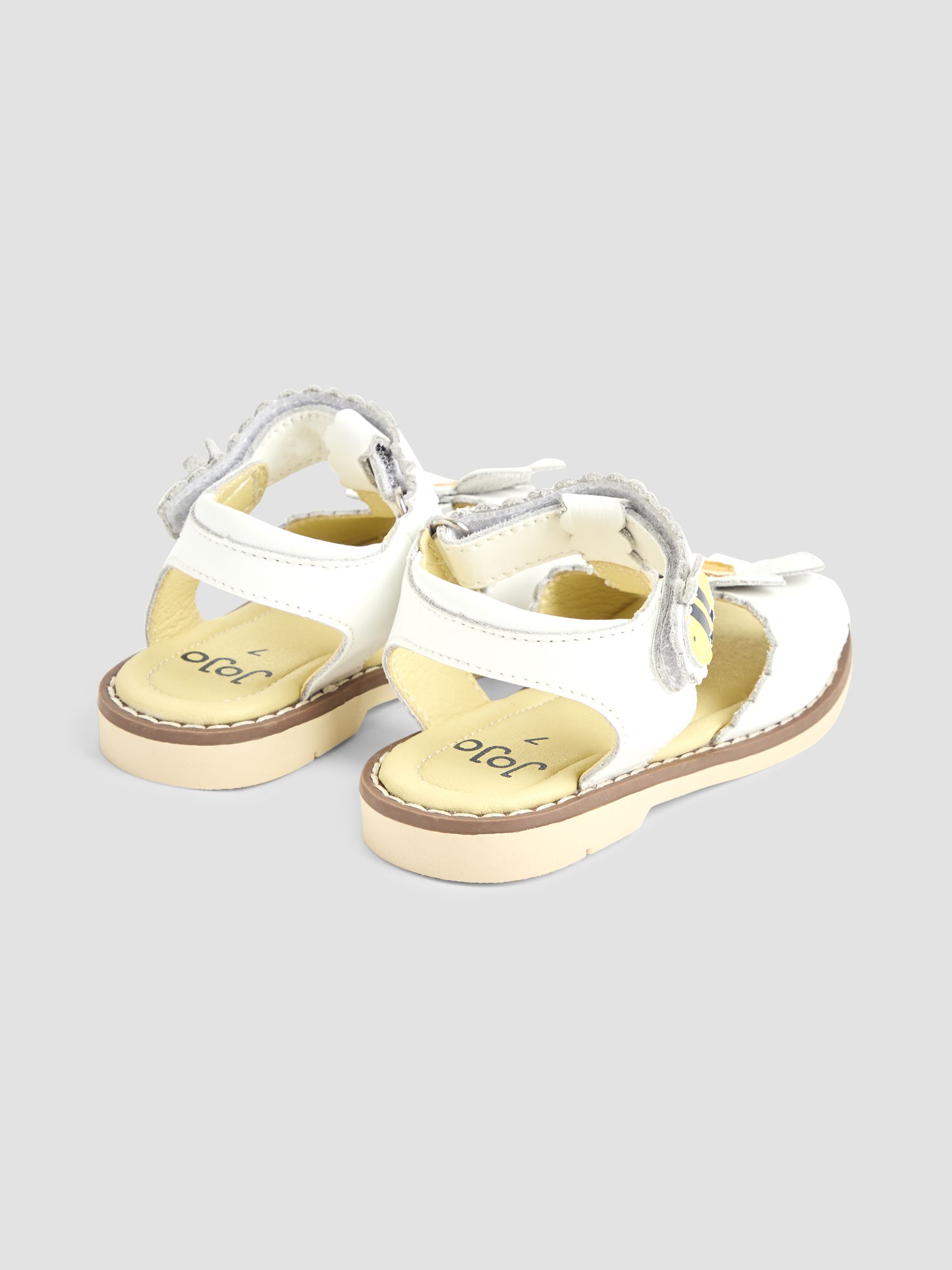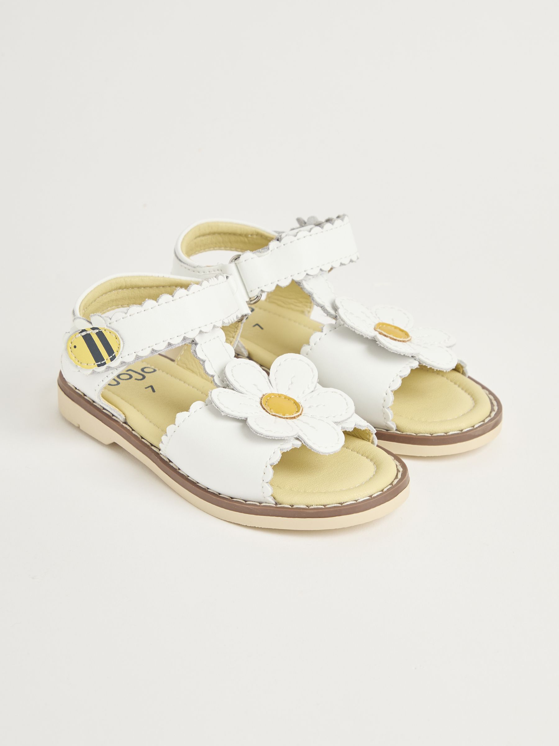 Staple summer sandals just got sweeter with these charming Flower Leather Sandals. The cushioned sole ensures total comfort for little feet, making them ideal for all-day wear, while allowing toes to breathe. Pair these beautiful blue sandals with any summer dress, T-Shirt and shorts, or to wear at the beach with swimwear and your little petal will be walking on sunshine all day long! White, scalloped-edge leather sandals 3D daisy motif Leather lining and cushioned sock for comfort Kid-friendly hook and loop fastening around ankle with bee detail Padded collar Wipe clean only