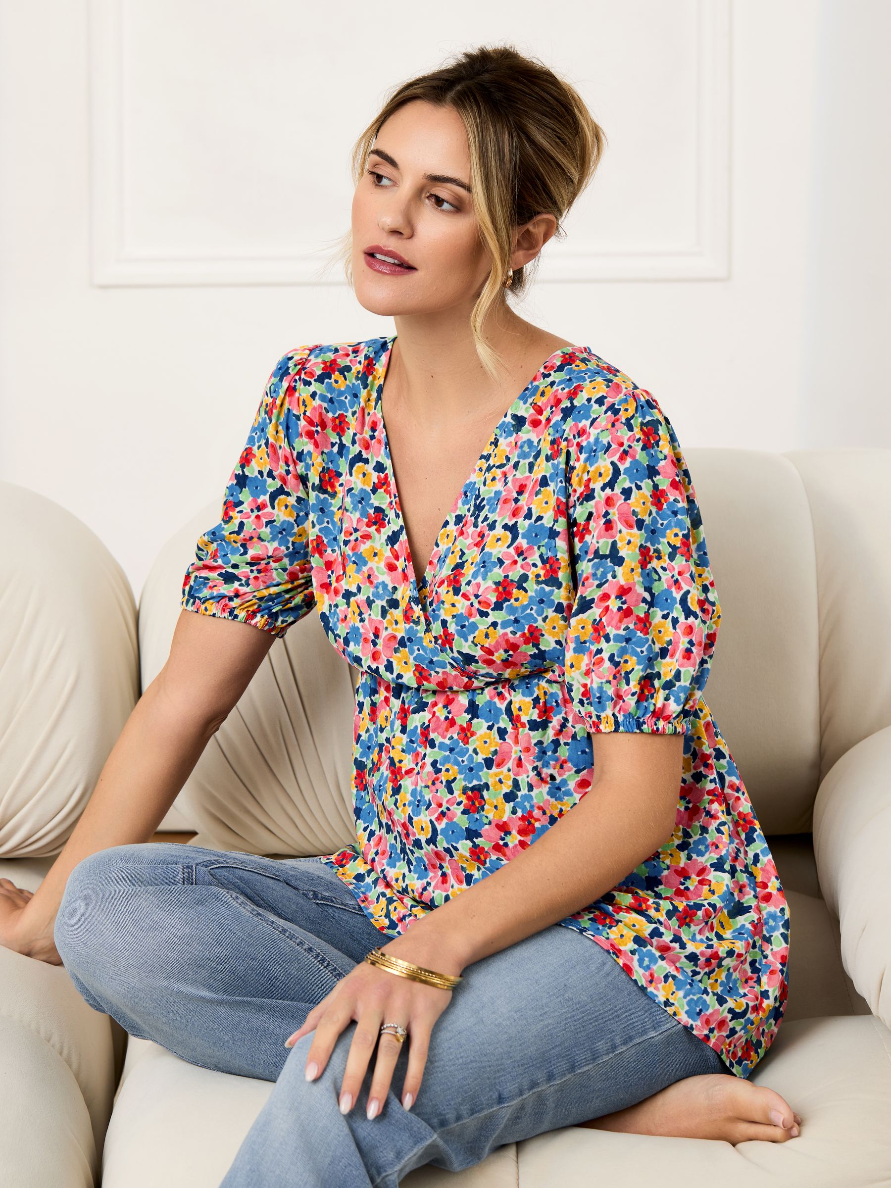 Freshly picked for you (and bump too!) this Floral Maternity Blouse is a lovely wardrobe treat for spring and summer. Featuring a flattering V-Neck and waist tie, as well as sweet puffed sleeves for an extra touch of femininity, this vibrant and colourful blouse is blooming with florals that can be paired with comfy jeans, leggings, or a beautiful flowy skirt for those breeze-catching days. Multicoloured floral maternity blouse. V-Neck. Puffed short sleeves. Machine washable.