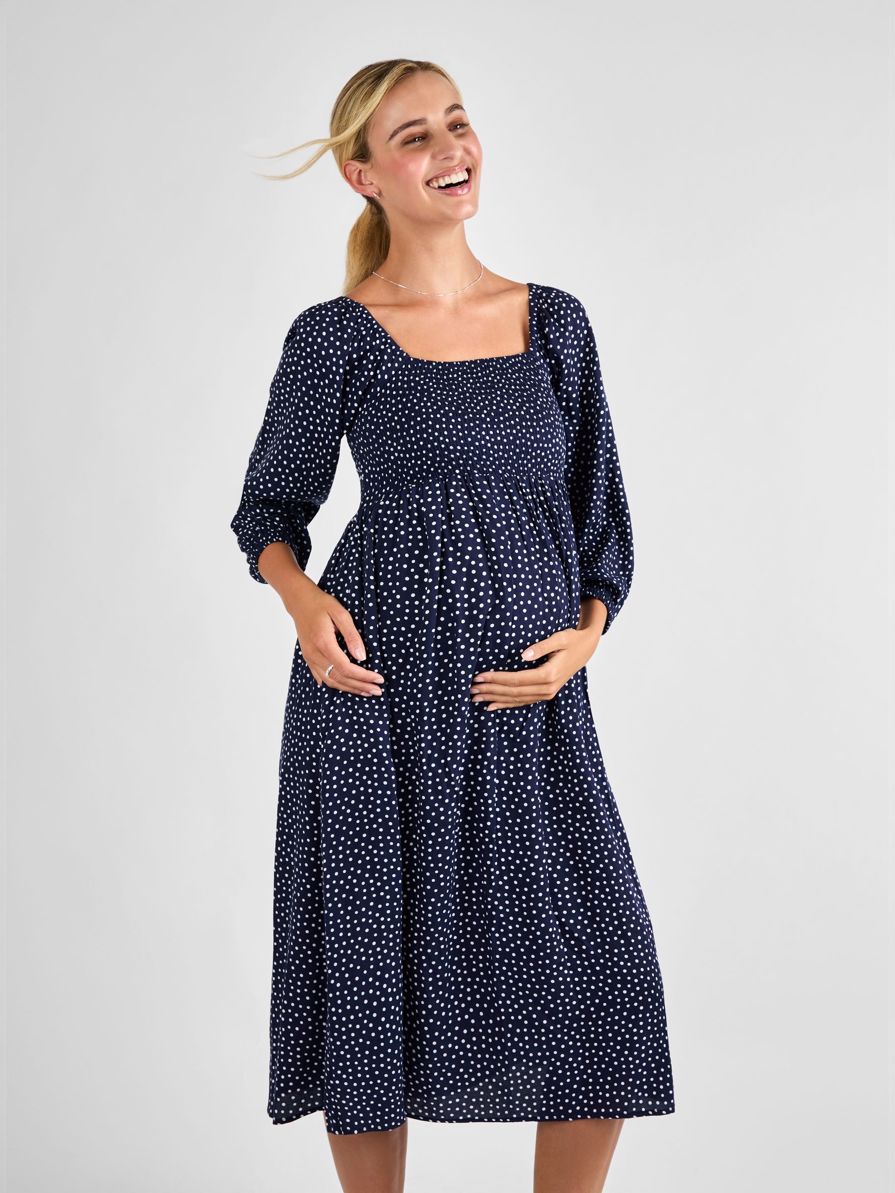 Get ready for meadow-dreaming days with this navy Shirred Maternity Midi Dress. Covered in delicate white spots, you and bump will be ready for all those springtime soirées, from picnics and garden parties to baby showers and strolls in the park. The comfy shirred bodice, two side pockets and long sleeves all come together to make this a must-have spring staple for mums-to-be. Navy blue midi dress. Shirred bodice. Ditsy floral print. Two side pockets. Long sleeves. Machine washable.