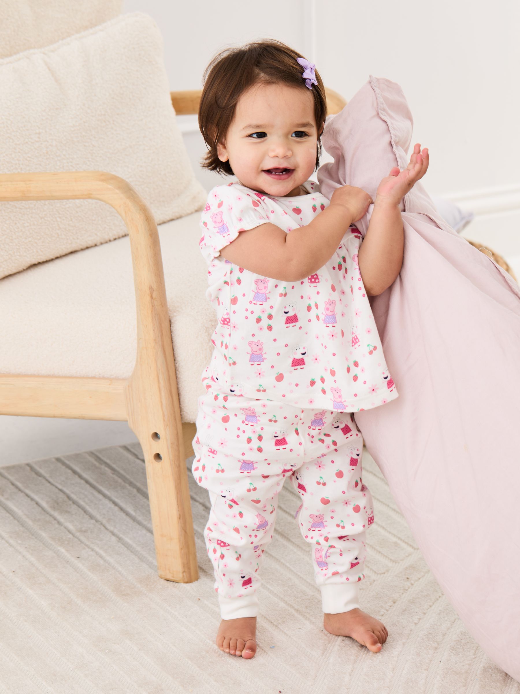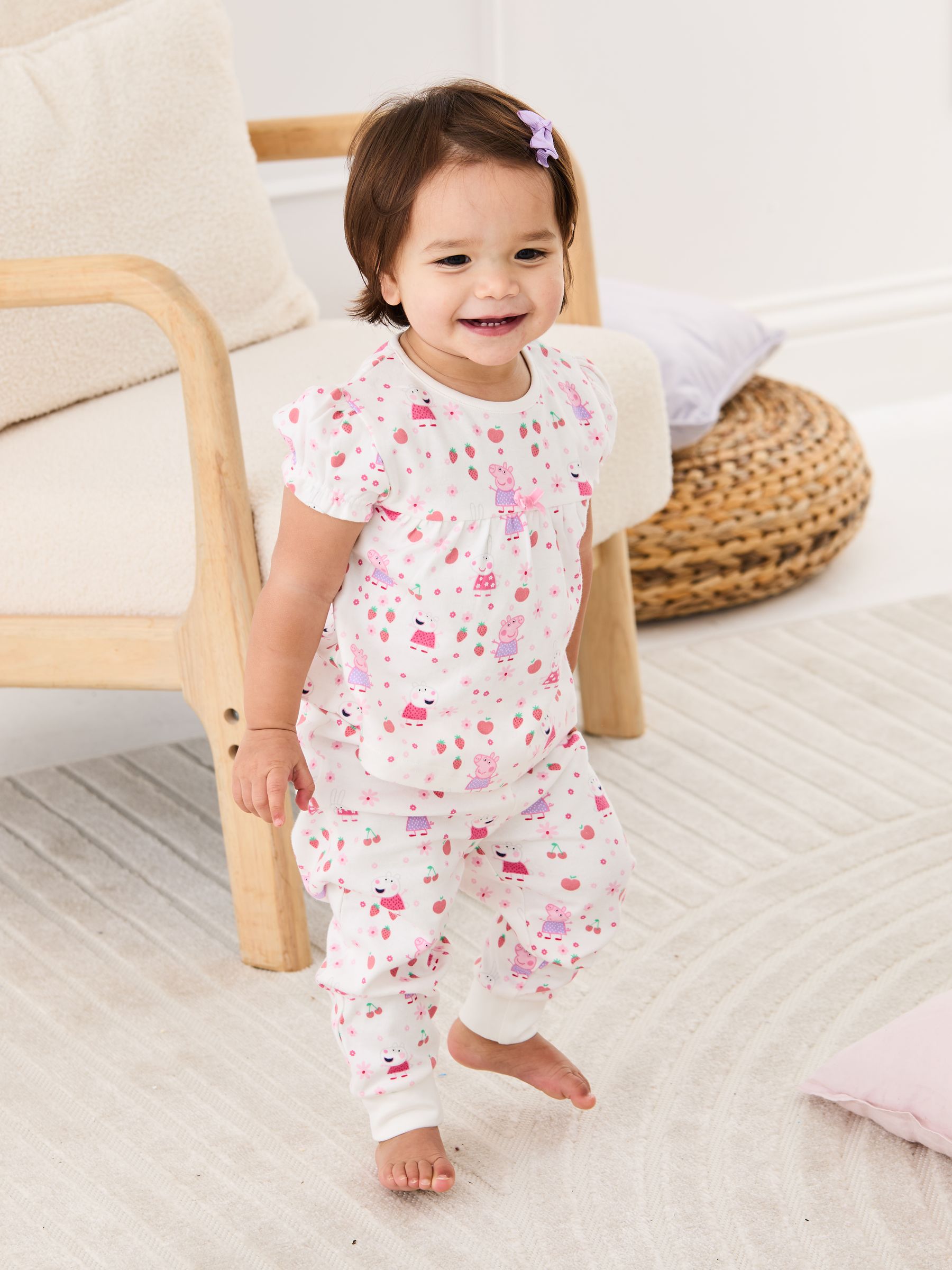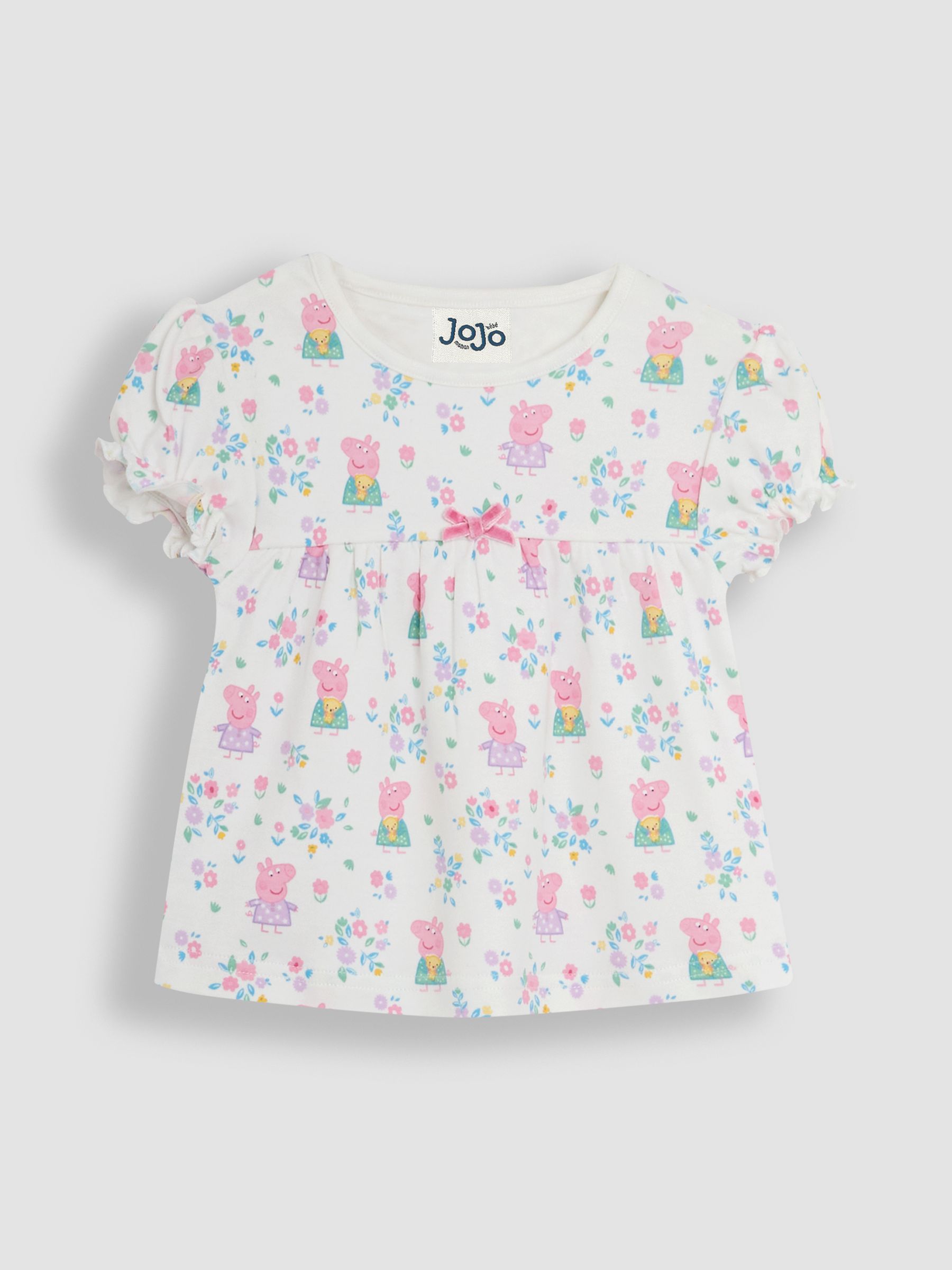 Time for a sweet dreams slumber party with Peppa! These Peppa Pig Jersey Pyjamas are the perfect set for storybook moments, tuck-in times and dreamland adventures. Made with soft jersey cotton that allows for comfort and breathability and an elasticated waistband that ensures ultimate stretch, little ones can wriggle and giggle whilst feeling snug all through the night. And the bow detail and all-over print of Peppa adds even more springtime sweetness to a good night's sleep. Peppa Pig jersey pyjamas All over Peppa Pig print Bow detail Short sleeves Cuffed hems on trousers Elasticated waistband Machine washable Warning: Keep away from fire and flames.