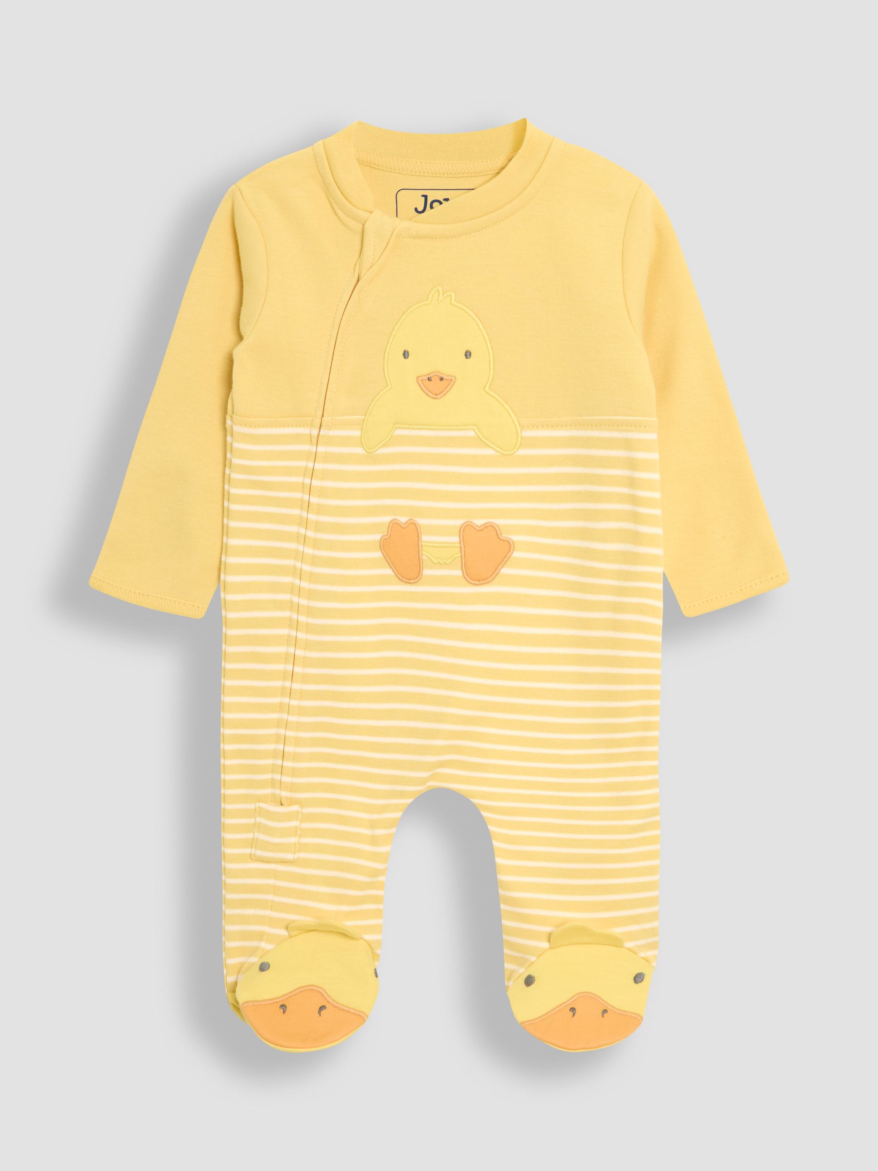 Quack, quack, and peep over stripes, keep your little one snuggly all day and night. This sweet, spring-ready sleepsuit comes with duck-print covered feet to keep tiny toes so so toasty, with a two-way zip to make it easier to change at night while retaining JoJo's usual quality and super soft touch. This is the perfect gift for new bundles of joy. Yellow sleepsuit with Breton-style stripes Duck design sleepsuit on the front and feet Supersoft touch 2-way concealed zip can be opened from the top or bottom for easy changing Fold over scratch cuffs up to size 9-12 months Sizes 9-12 months and up feature anti-slip dots on feet KEEP AWAY FROM FIRE Machine washable Warning: Keep away from fire and flames.