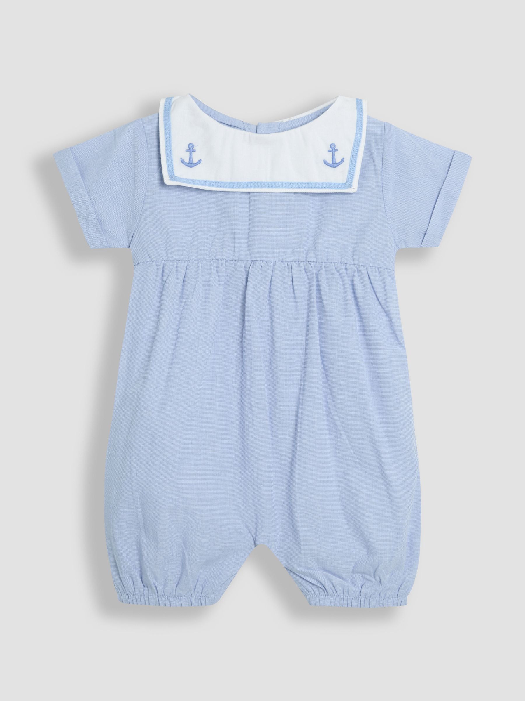Anchors away! Keep your small sailor cool and comfy in this quaint Sailor Collar Romper. With a timeless blue pinstripe design, charming sailor collar and poppers around the crotch for easy changing, this piece is a picture-perfect addition to any holiday wardrobe. Blue pinstripe Shorts with elasticated bottom Short sleeves Sailor collar with anchor print Poppers at the crotch for easy changing Machine washable