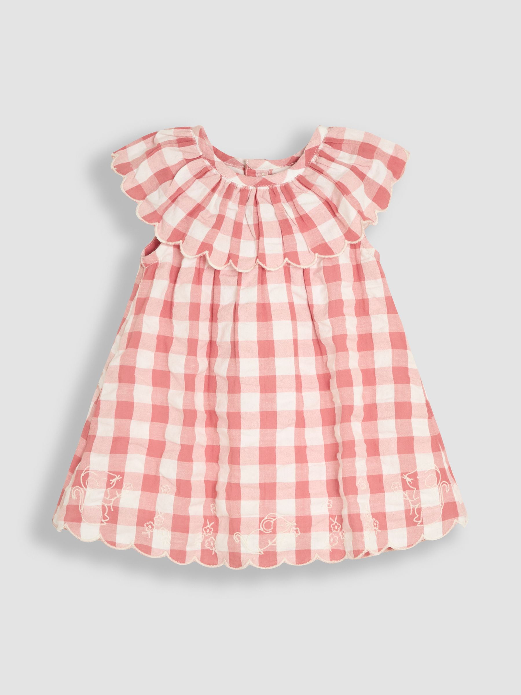 Hop into ice-cream melting days and get your little one sunshine-ready with this 3-Piece Scallop Baby Dress, Knickers & Hat Set. Made from comfortable woven cotton, they can enjoy fuss-free fun in the sun in the pink gingham and matching knickers. The subtle mouse embroidery around the hem adds a lovely finish, and the matching hat has two ribbons that can wrap under the chin to make sure it doesn't fall off as they play. Pink gingham baby dress, knickers, and hat Mice design along the hem Frilled sleeves Comfy elastic leg holes Poppers at the back for easy dressing Matching sun hat with frilled rim and chin ties Machine washable WARNING: Sun exposure causes skin damage. This item will only protect areas directly covered and, to a lesser extent, areas shaded from the sun. Only covered areas are protected; other exposed areas of the body should be protected by a high-factor sun cream. Protection offered by this item may be reduced with use, or if stretched or wet. Young children are particularly at risk of sunburn because of their delicate skin, Babies are especially vulnerable. Keep babies out of the sun. Hats cover heads and the nape of necks, plus help protect eyes from glare.