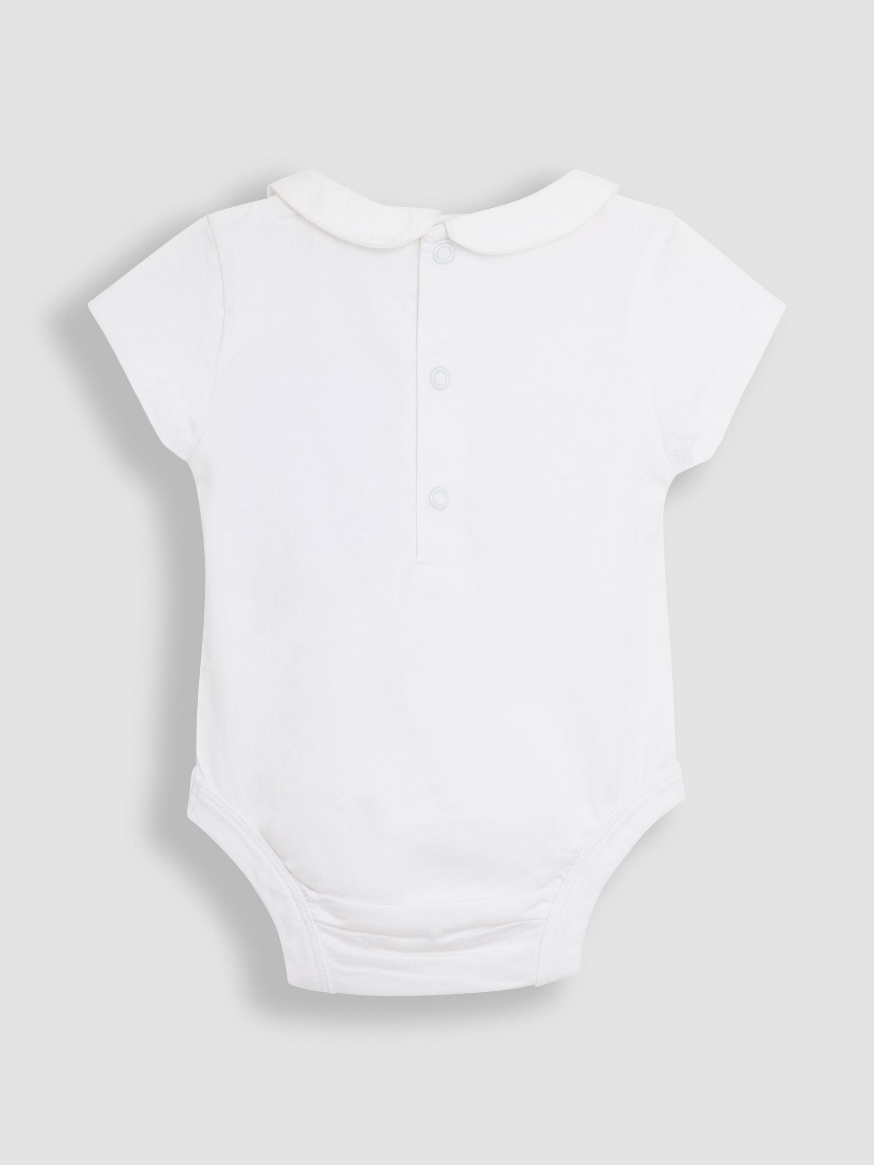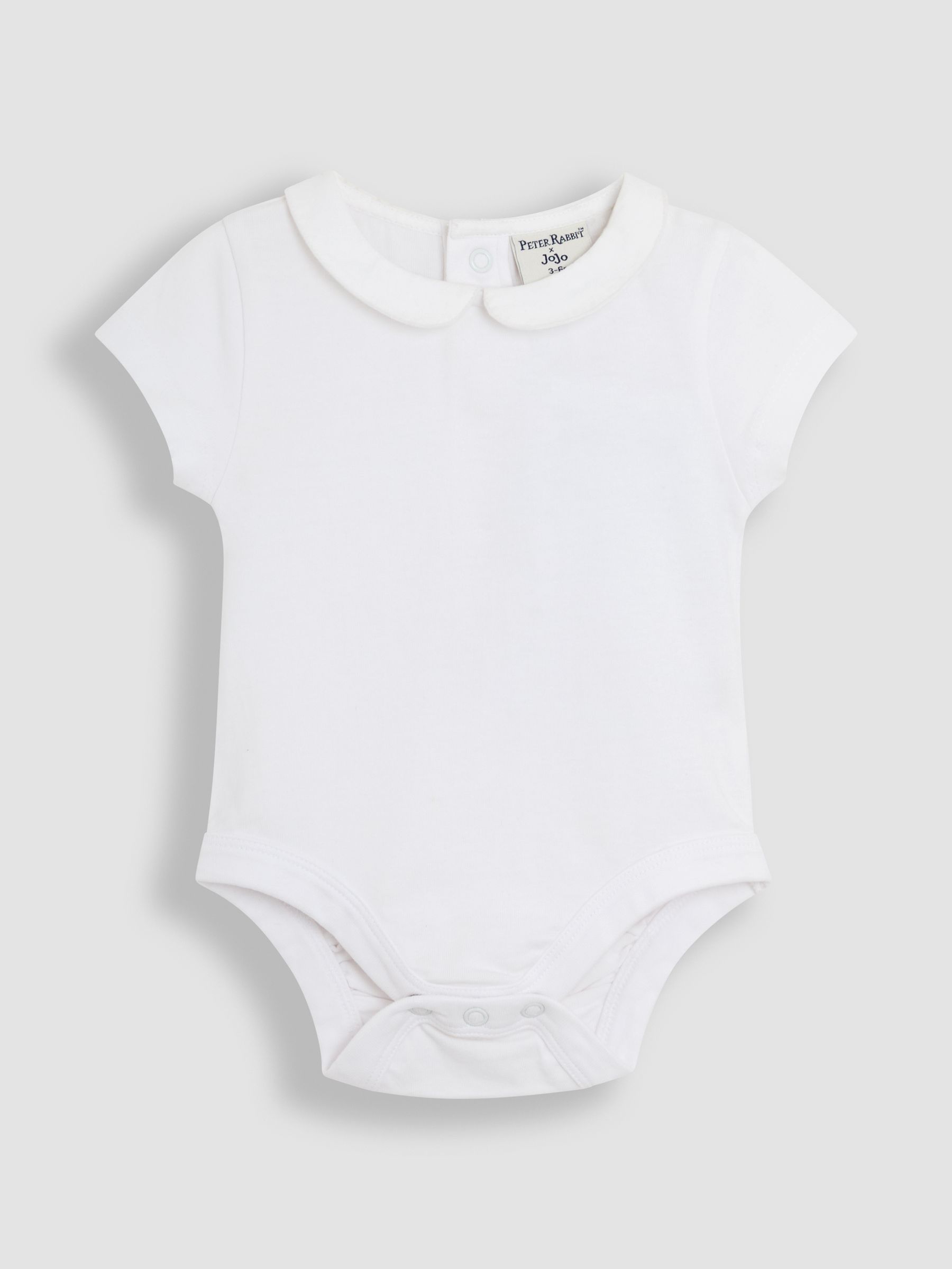 Hop into the charm of Beatrix Potter's Peter Rabbit™ with this 2-Piece Dungarees & Body Set. The dungarees feature a light neutral pinstripe design with a Peter Rabbit™ motif on the chest. The ruched details and white collared body suit complete the charm of this set, making it a practical and perfectly precious outfit for those meandering-through-meadows days. Stone pinstripe dungarees Peter Rabbit™ motif on chest Buttoned straps for easy dressing Side buttons White short sleeves, Peter Pan collar bodysuit Machine washable
