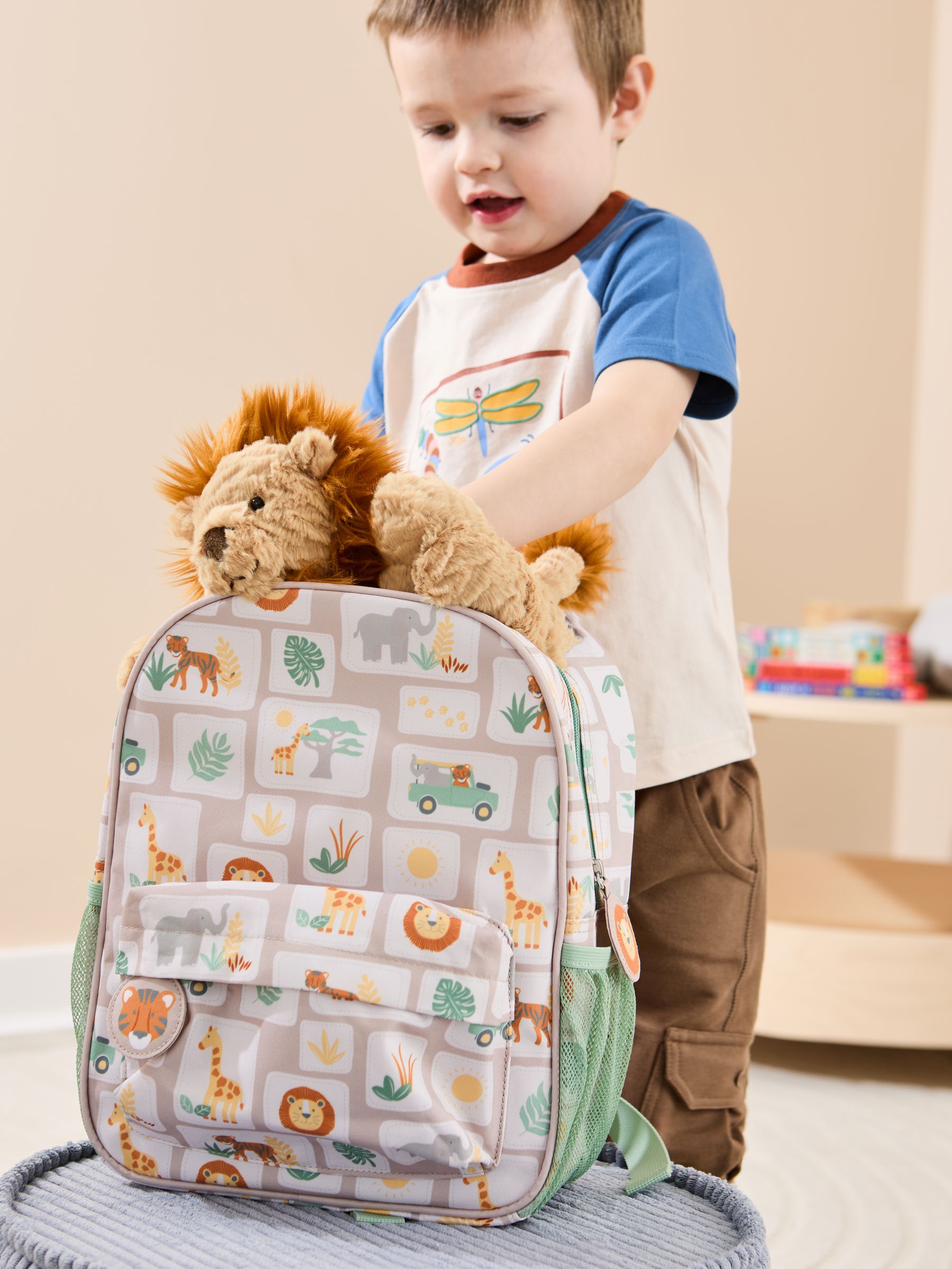 When packing for nursery and day trips, this backpack is the coolest thing to take on adventures. Say hello to this Safari stamp print Medium Backpack! Featuring adjustable straps, it's not only comfy, but it also encourages your little ones to take responsibility for their belongings. This backpack is just the right size for lunchtime-munching and snacktime-crunching and comes with a handy side pocket that's perfect for storing a drink, making it an absolute must-have, whatever they get up to throughout the day, ready for wildlife exploring days! Safari print backpack Large zipped compartment and zip front pocket Name tag inside Adjustable shoulder straps Hanging loop and carry handle Drinks holder Wipe clean only Suitable from 3 years 32cm x 25cm x 12cm
