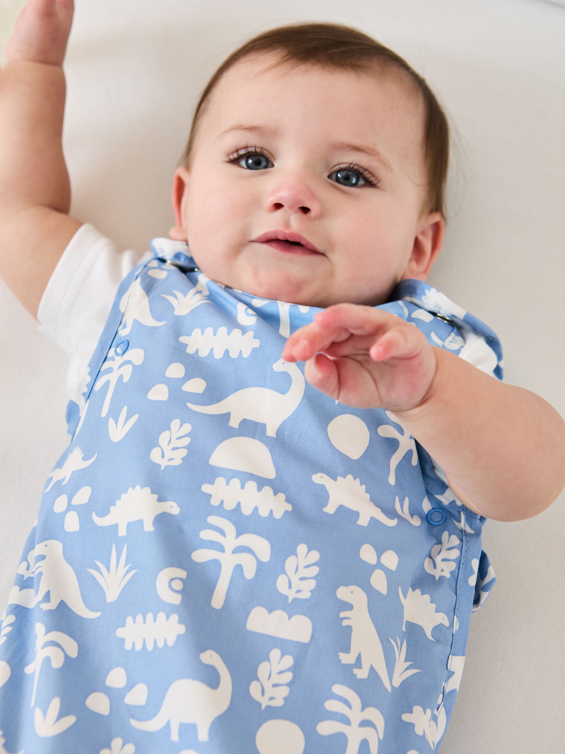 Find more information about tog ratings and temperature in our handy guide here Find more information about tog ratings and temperature in our handy guide here. Make sure your baby enjoys a fuss-free sleep in the summertime with this 1 Tog Baby Sheet Sleeping Bag. Designed to regulate a child’s body temperature to keep them snug without the need for blankets, this sleeping bag offers an extra layer of bedtime cosiness to guarantee they’ll catch those ''zzz’s''. Available in 1 tog — the thinnest tog — our blue dino sheet sleeping bag is made for those balmy summer nights and holidays – a striking seasonal bedtime look that’s perfect for the summer months. Adjustable poppers change the sleep sheet’s length to fit your child best, and the sleeveless cut keeps kids cool. Approx. 1 Tog Poppers to adjust length Reversed safety zip 0–6 months: 70cm 6–18 months: 90cm Please refer to sleeping bag warnings for tog levels Conforms to BS EN 16781:2018 WARNING! KEEP AWAY FROM FIRE WARNING! Do not use if the child can climb out of the cot WARNING! Do not use in combination with other bedding items (e.g., cot duvet or blanket). Take into account the room temperature and the child’s sleepwear. Overheating can endanger the life of your child WARNING! Do not use if the child’s head can pass through the neck opening when fastened for use WARNING! Ensure that the neck and arm openings are securely fastened Please see our Sleeping Bag Size Guide for which bags to use Save £10.00* when buying 2 items from JoJo Maman Bebé Sleeping Bags Range. * Saving applied will be apportioned across all qualifying items. To get the saving, you must order the qualifying items within the same order at the same time. If you later return one of the items, you will not be entitled to the discount. Offer applies to selected items at full price. Please refer to T&Cs for full details.
