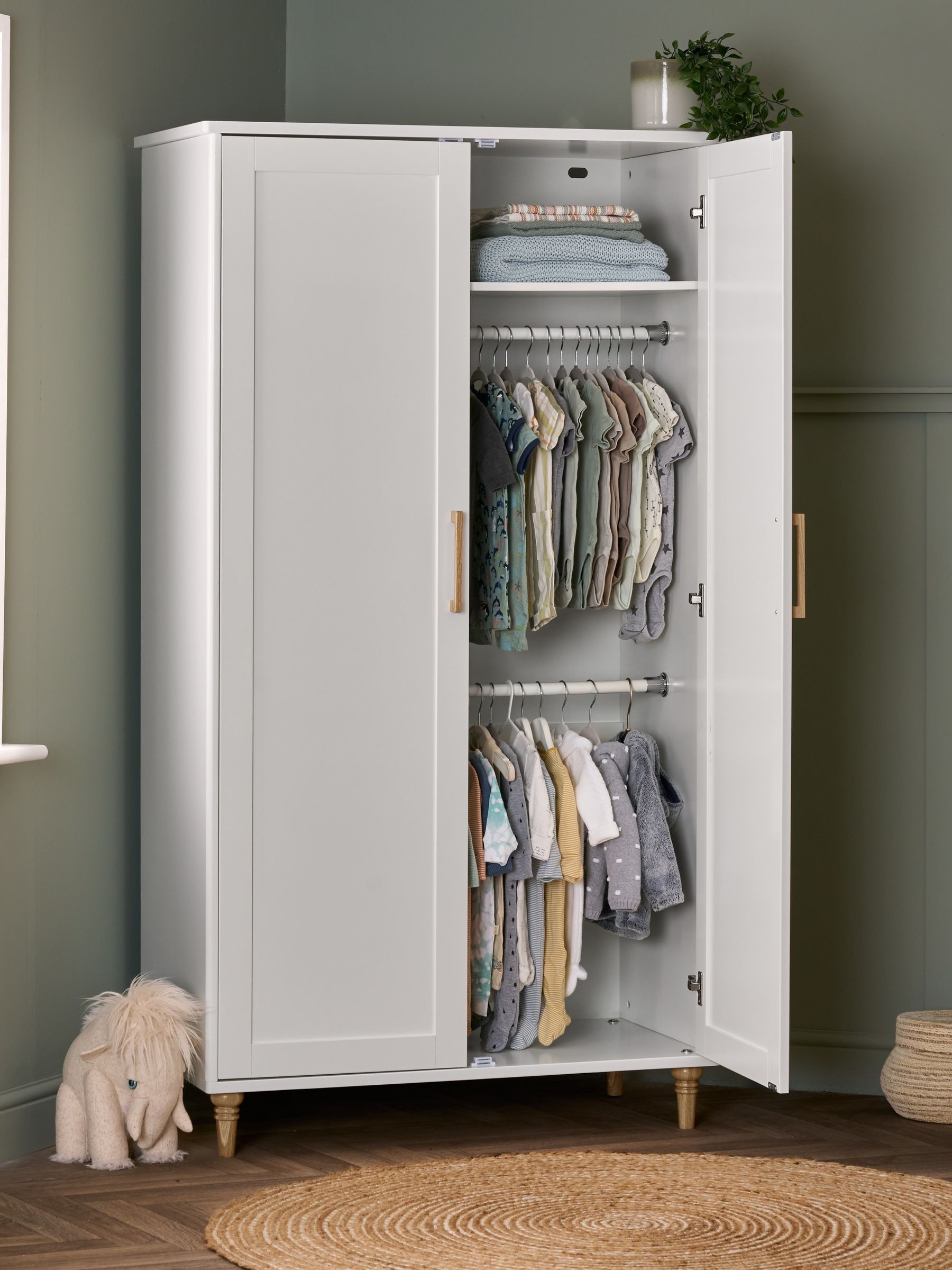 The Orla Wardrobe provides spacious, beautifully crafted storage that combines elegance and functionality. With its Shaker-style doors, natural wood handles, and hand-crafted feet, it perfectly complements the Orla Cot Bed and Changing Unit. Behind its doors, the wardrobe reveals a spacious interior designed to keep everything neatly organised. It has a wide shelf for folded essentials and two sturdy hanging rails for your little one’s outfits. It’s the perfect storage solution that keeps everything easy to reach and helps you create a tidy space. The wardrobe’s soft cotton white finish and natural wood details bring a calming touch to your baby’s room. The Orla Wardrobe’s adaptable layout accommodates changing storage needs as your child grows, from the tiniest onesies to those big dressing-up outfits. The Orla Wardrobe encourages independence with an easy-to-reach lower rail. As they grow older, you can even remove the bottom rail to make space for longer clothes, including their school uniforms, well into those tween years. More than just a piece of furniture, this wardrobe becomes a part of your child’s space, offering timeless style and reliable craftsmanship that fits well as they move through each stage. Height 93.5cm Width 50.5cm Depth 151cm This item will be delivered directly to you from our branded partner. Prior to delivery our partner or their carrier will contact you to confirm a date. Unfortunately weekend deliveries are currently unavailable.<br/><br/> Please note that delivery is unavailable outside the UK Mainland. Multibuy: Save 10% when buying 2 or more items each priced at £150 or above across selected Sofas, Chairs, Rugs, Beds, Mattresses and Furniture Collections. Multibuy is only applicable to the UK Mainland Area.* Condition: * Saving applied will be apportioned across all qualifying items. To get the saving, you must order the qualifying items in the same order at the same time. If you later return one of the items, you will not be entitled to the discount. Offer applies to selected items at full price. Please refer to T&Cs for full details. This product requires self-assembly. Regrettably, self-assembly items cannot be returned once assembly is part or fully completed, unless they do not comply with the description given, are faulty, or are not fit for any stated purpose. Your statutory rights are not affected.